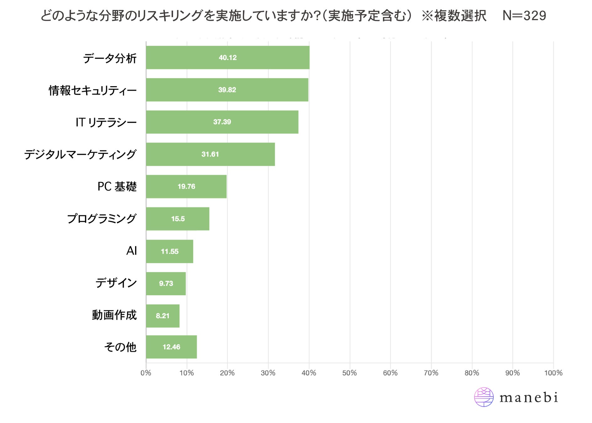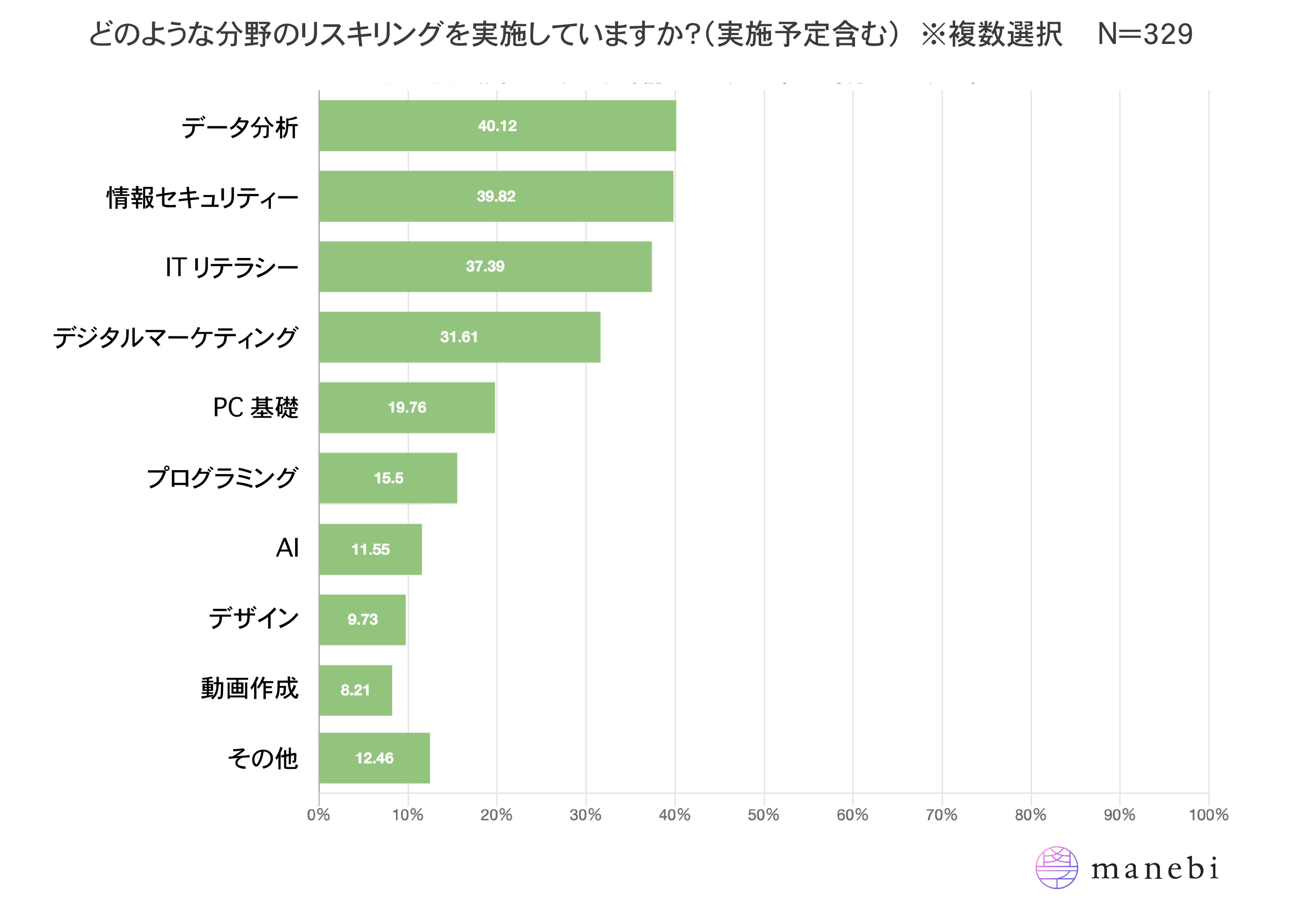 - リスキリングの学習分野としては、「データ分析」「情報セキュリティー」が⼈気