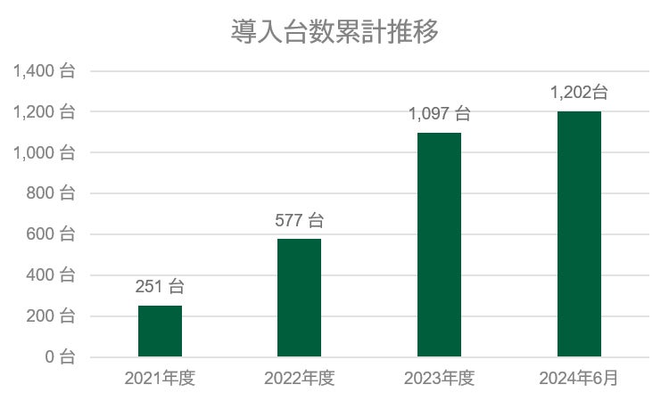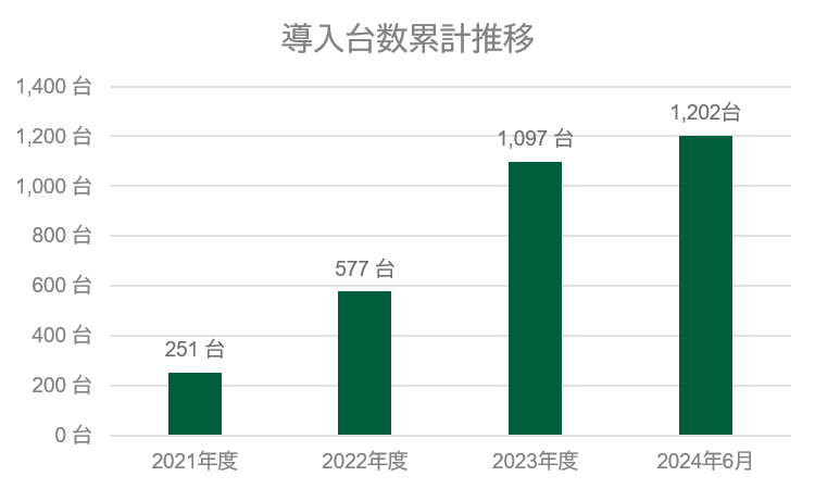 その間、着実に導入数を伸ばし、約3年半弱の期間を経て2024年6月時点で全国239か所への導入台数が1,200台を突破しました。本実績は、国内における類似のサービスとしては未だ実証レベルであったり、導入数も数台といった事例が多い中、商用化している企業・自治体向けスマート充電サービスとしてはトップクラスの実績となっております。(当社調べ)