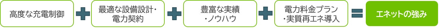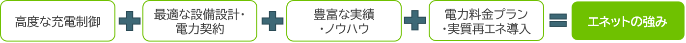 現在では競合他社の類似サービスや複数の用途を付加した多機能サービスも多く現れ、EVの導入を検討されるお客さまにとっては選択が難しくなっております。多機能サービスは設備構築コストが高くなるため投資回収が難しくなりがちです。当社のEnneEVサービスは、高度な充電制御機能でありながらも、お客さまのコストを最小化するため無駄を省き、必要十分な範囲で高い費用対効果が得られるサービスになっております。加えて、トップクラスの実績に裏付けされた豊富な経験とノウハウと共に、信頼あるサービスの提供ができることが強みです。