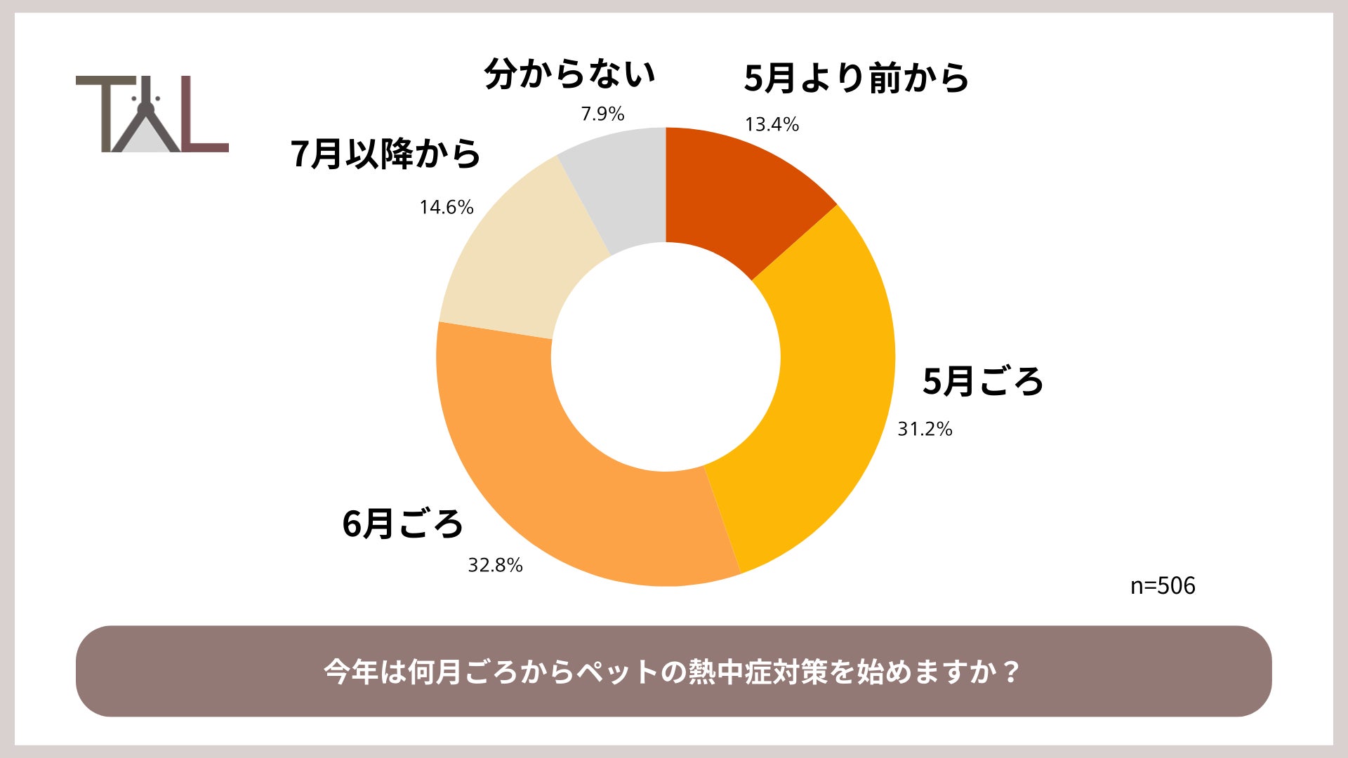 犬猫の飼い主506名に対し「 今年は何月ごろからペットの熱中症対策を始めますか?」と質問したところ、「5月より前から」(13.4%)、「5月ごろ」(31.2%)、「6月ごろ」(32.8%)と、梅雨入り前の今の時期から対策を始めると答えた方が全体の7割を超える結果となりました。「7月以降から」(14.6%)、暑さが本格化してから熱中症対策を開始する飼い主は少数派のようです。