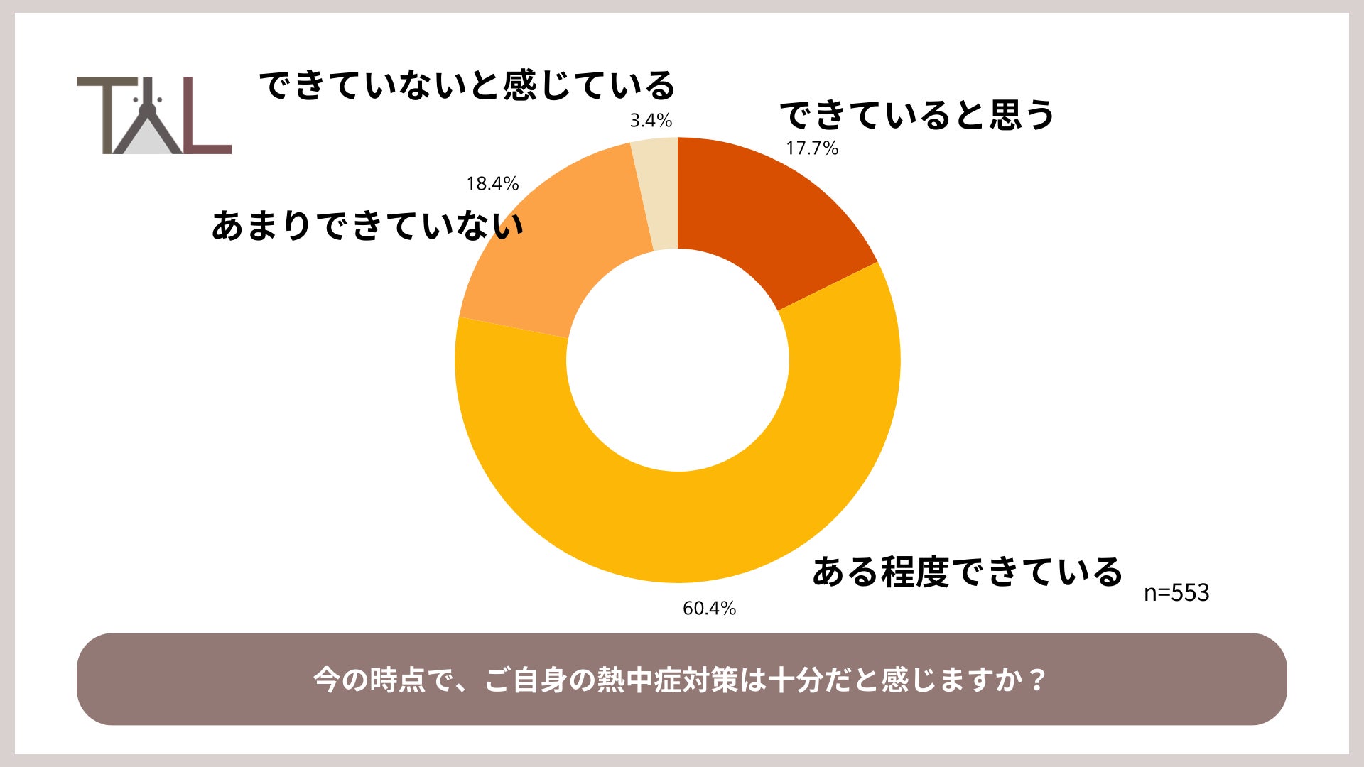 犬猫の飼い主553名に対し「今の時点で、ご自身の熱中症対策は十分だと感じますか?」と質問したところ、「できていると思う」と回答した飼い主は全体の17.7%にとどまる結果に。もっとも多かった回答は「ある程度できている」(60.4%)。「あまりできていない」(18.4%)、「できていないと感じる」(3.4%)を合わせて約2割の飼い主が、自身の熱中症対策に自信がないことが分かりました。