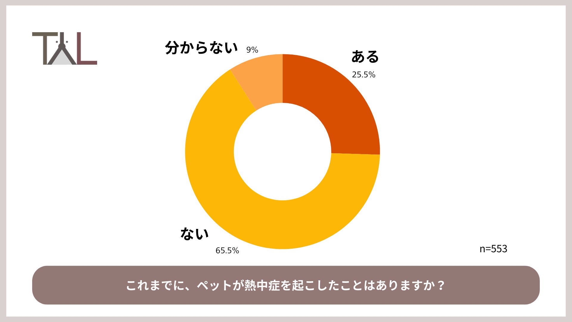 犬猫の飼い主553名に対し「これまでに、ペットが熱中症を起こしたことはありますか?」と質問したところ、「ある」と回答した方が25.5%で、犬猫の飼い主の4人に1人がペットの熱中症を経験していることが分かりました。「ない」と答えた方が65.5%、「分からない」という回答も9.0%見られました。