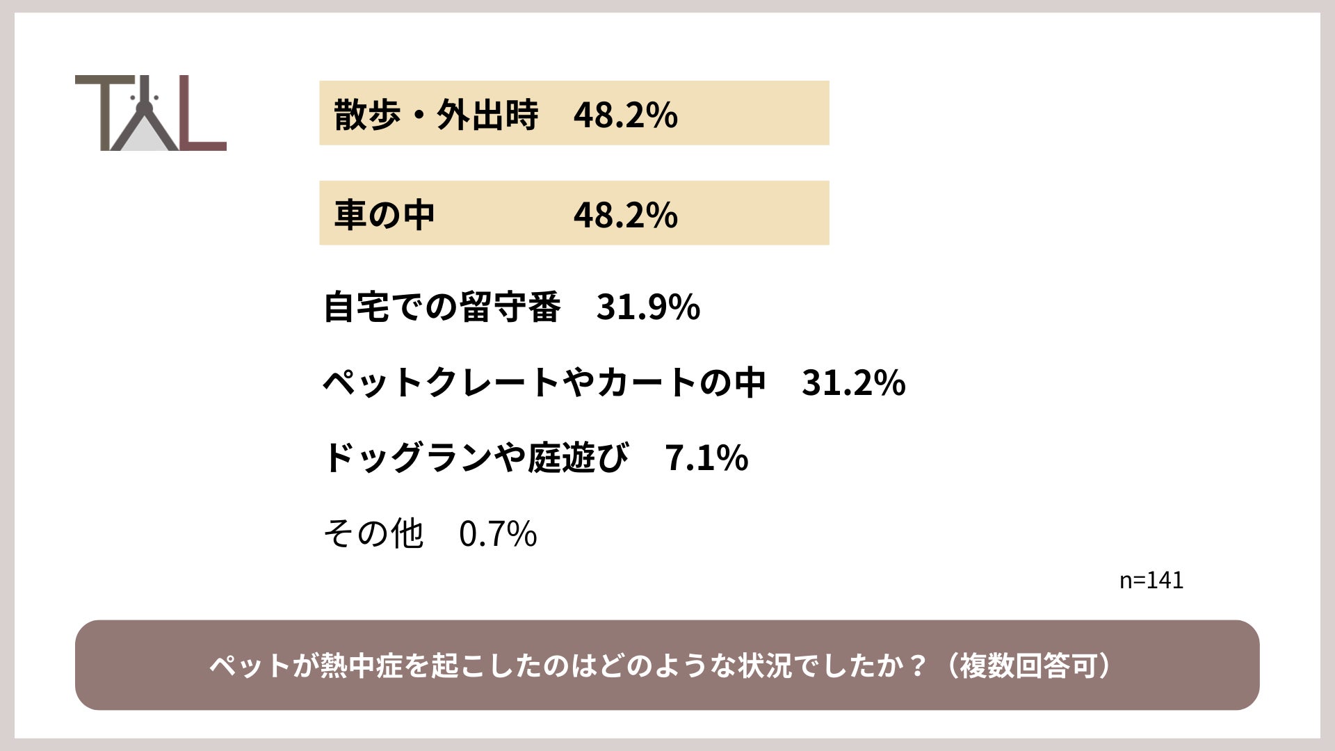 ペットの熱中症を経験したことがあると答えた犬猫の飼い主141名に対し「ペットが熱中症を起こしたのはどのような状況でしたか?」と質問したところ、「散歩・外出時」または「車の中」と答えた方がそれぞれ48.2%という結果となりました。次に多かったのが「自宅での留守番」(31.9%)で、お出かけ時だけではなく日常生活のなかにもあらゆる場面に熱中症のリスクが潜んでいることが分かります。