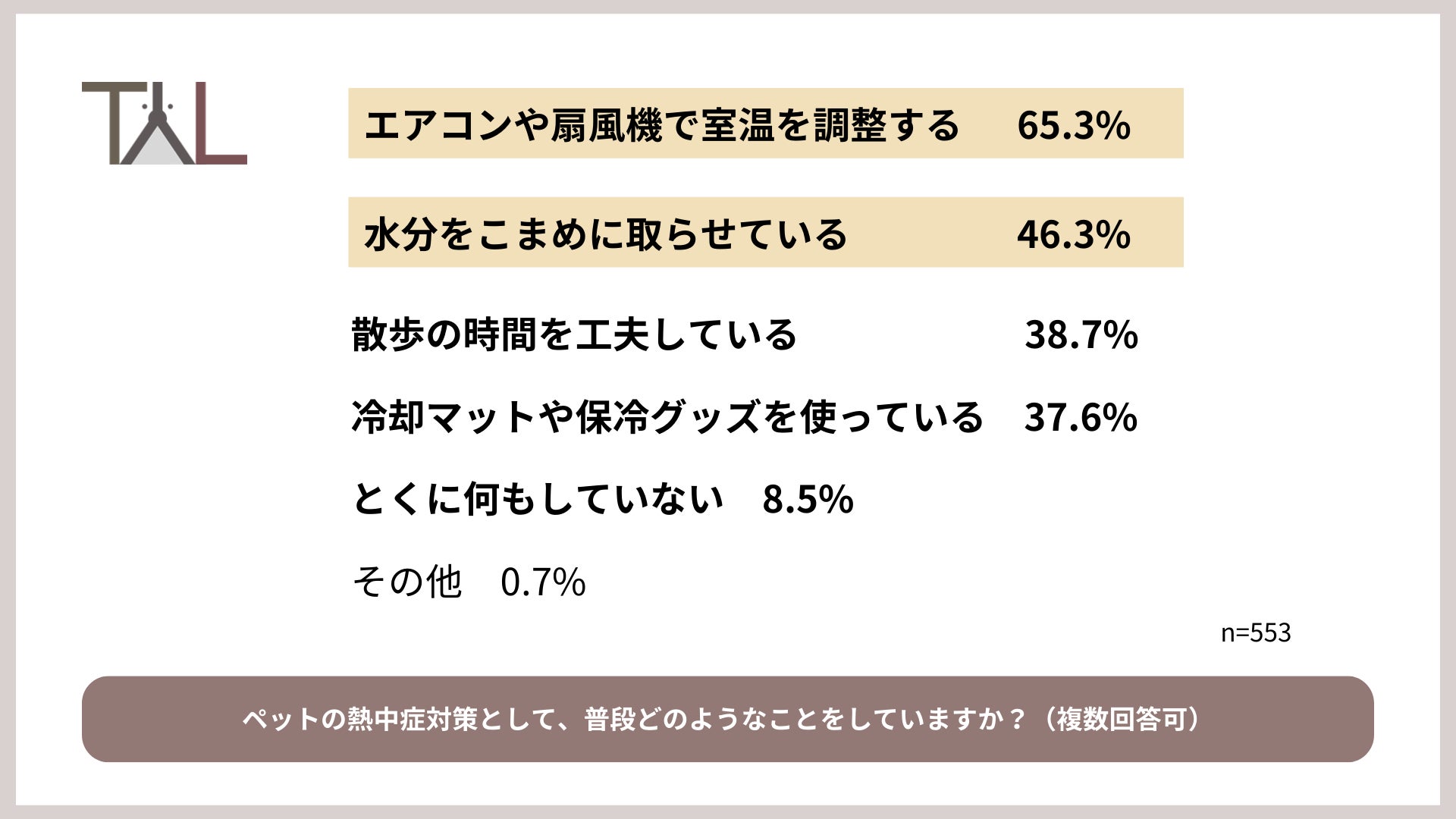 犬猫の飼い主553名に対し「ペットの熱中症対策として、普段どのようなことをしていますか?」と質問したところ、過半数を超える65.3%の方が「エアコンや扇風機で室温を調整する」と回答しました。その他「水分をこまめに摂らせる」(46.3%)、「散歩の時間を工夫する」(38.7%)、「冷却マットや保冷グッズを使う」(37.6%)などの回答が見られました。