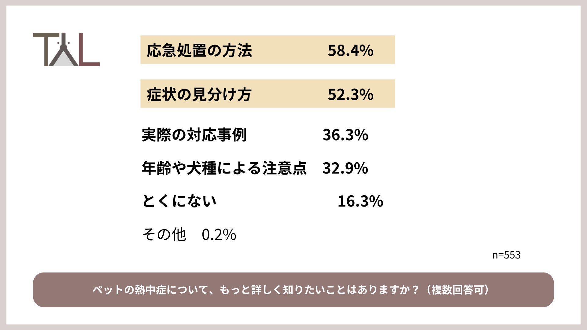 犬猫の飼い主553名に対し「ペットの熱中症について、もっと詳しく知りたいことはありますか?」と質問したところ、「症状の見分け方」(52.3%)、「応急処置の方法」(58.4%)など、熱中症を発症した際の対応に関する情報を求める回答が多く集まりました。その他、「実際の対応事例」(36.3%)や、「年齢や犬種による注意点」(32.9%)という意見も出ました。