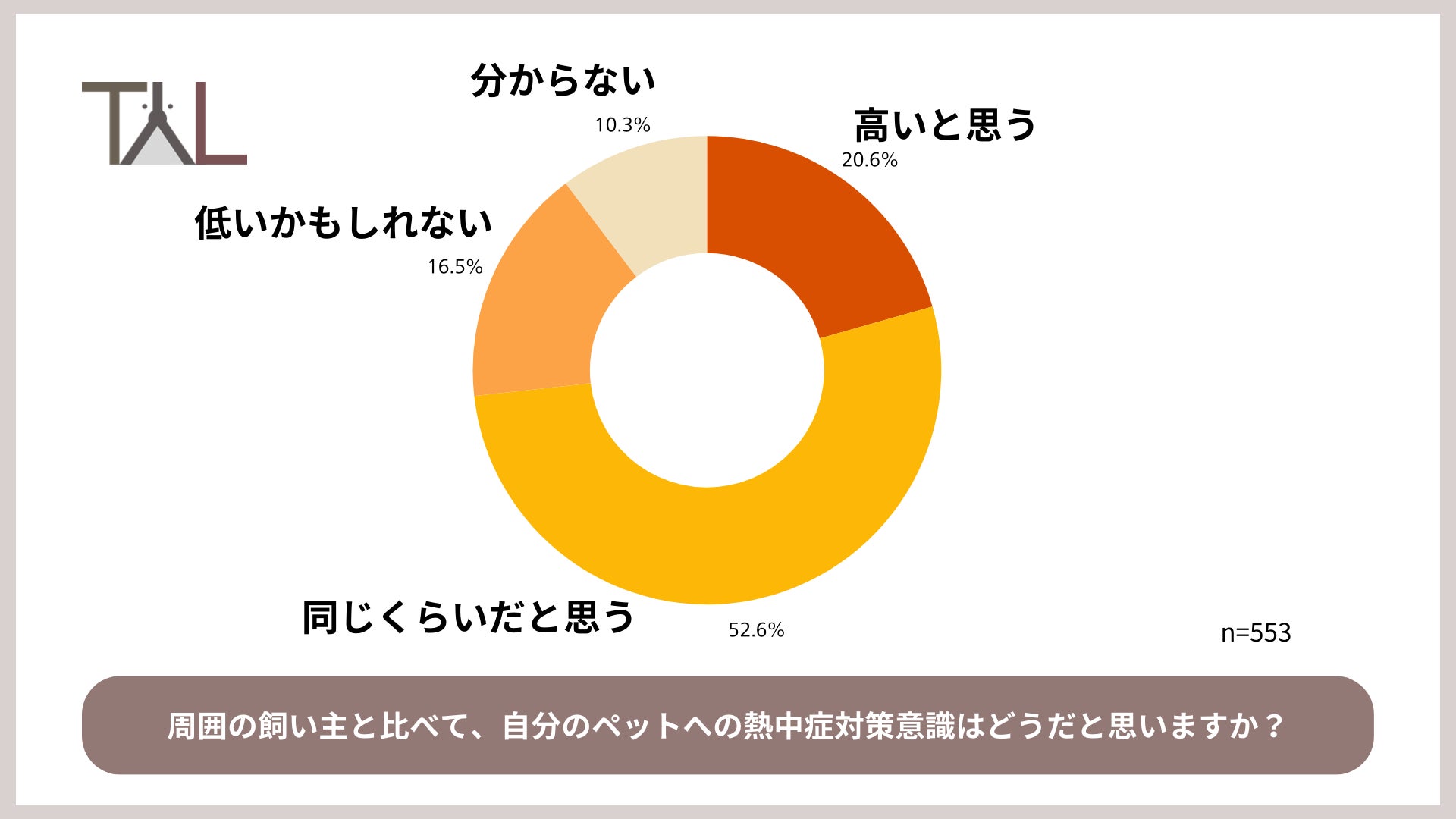 また、犬猫の飼い主553名に対し「周囲の飼い主と比べて、自分のペットへの熱中症対策意識はどうだと思いますか?」と質問したところ、約半数の52.6%の飼い主が(周囲と)「同じくらいだと思う」と回答しました。周囲と比較して熱中症対策意識が「高いと思う」との回答が20.6%、「低いかもしれない」は16.5%、「分からない」は10.3%という結果となりました。