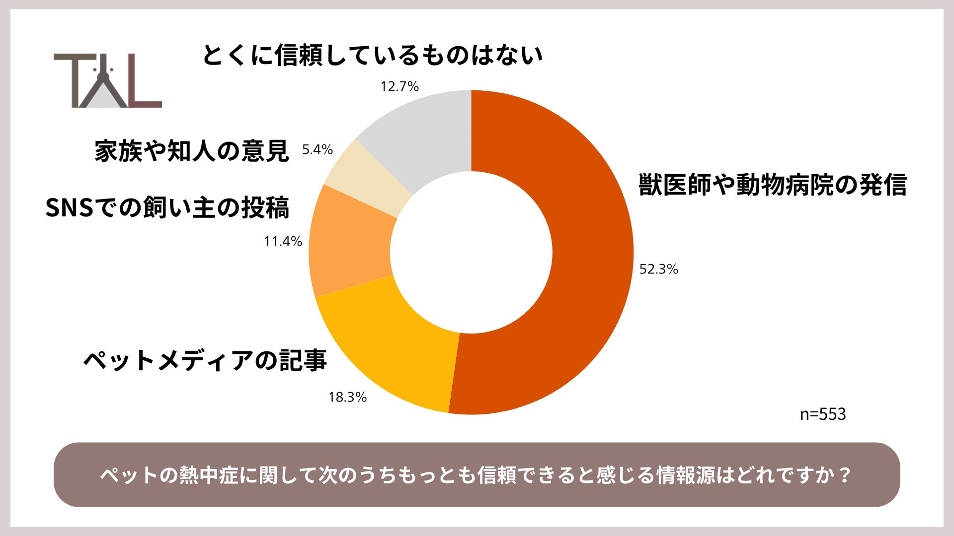 また、犬猫の飼い主553名に対し「ペットの熱中症に関して次のうちもっとも信頼できると感じる情報源はどれですか?」と質問したところ、52.3%の飼い主が「獣医師や動物病院の発信」と回答しました。多くの飼い主が、他の情報源と大きな差をつけて獣医師や動物病院の発信を信頼していることが分かります。そのほかでは「ペットメディアの記事」(18.3%)、「SNSでの飼い主の投稿」(11.4%)、「家族や知人の意見」(5.4%)といった意見も。一方で「とくに信頼しているものはない」と回答した方も全体の12.7%見られ、ペットの熱中症について飼い主が信頼できる情報が不足している現状も見えてきました。