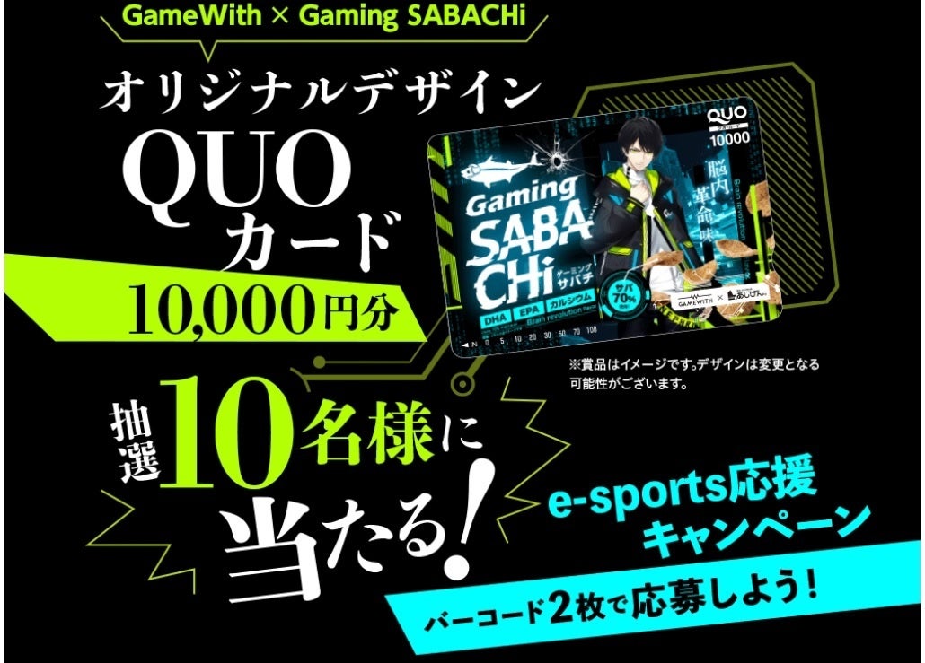 商品パッケージ裏のバーコードを2枚集めて郵送いただいた方の中から、抽選で10名様にGaming SABACHi(脳内革命味)オリジナルデザインQUOカード(10,000円分)が当たります。