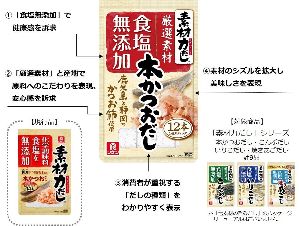 このたび、食生活における健康意識や素材へのこだわり意識の高まりを踏まえ、素材力だしの特長を分かりやすく表現したデザインに変更します。これにより、素材力だしの提供価値である「健康感」と「安心感」を皆さまにお届けしていきます。