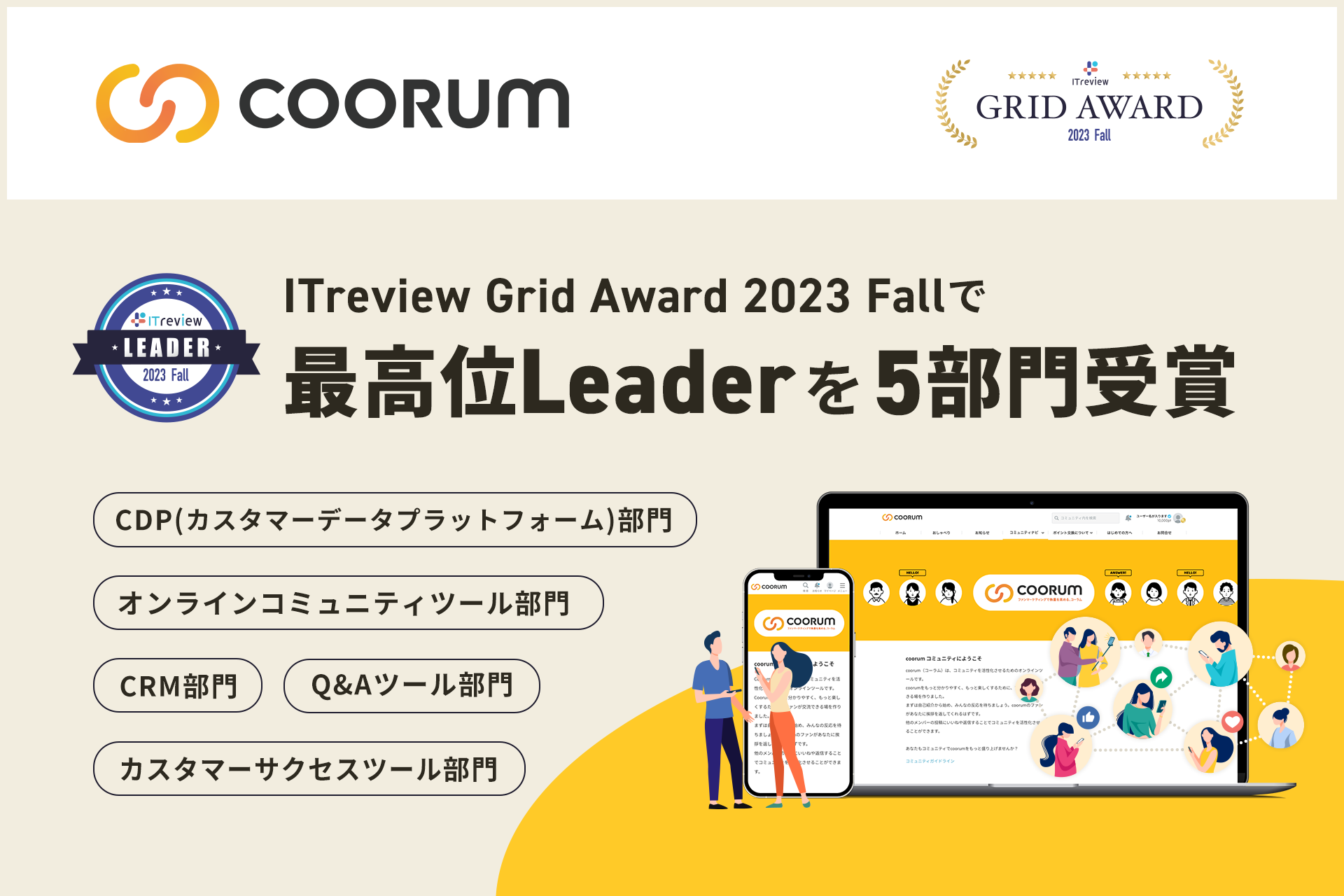 ロイヤル顧客プラットフォーム「coorum(コーラム)」が、「ITreview Grid Award 2023 Fall」の5部門で最高位「Leader」を受賞