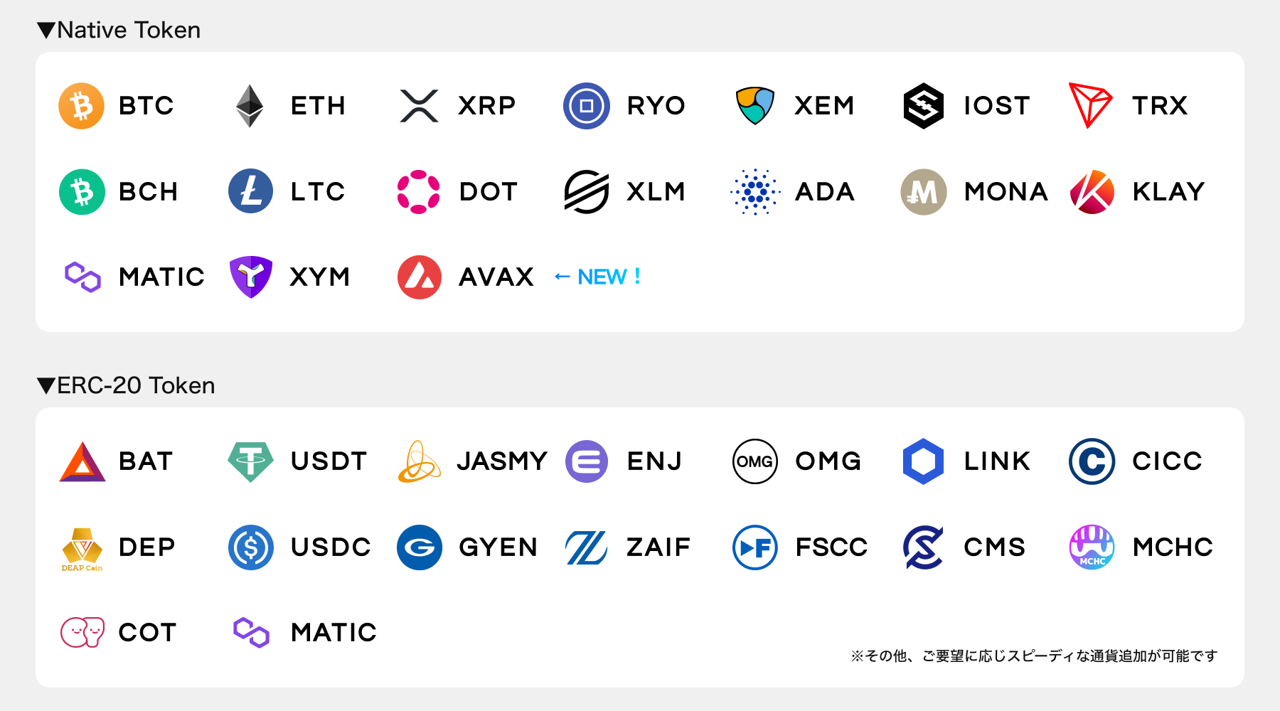 今回のAVAX追加により、Ginco Enterprise Walletの対応通貨は全33種類となりました。また、ERC-20トークンの通貨追加は要望に応じてすぐに対応可能です。