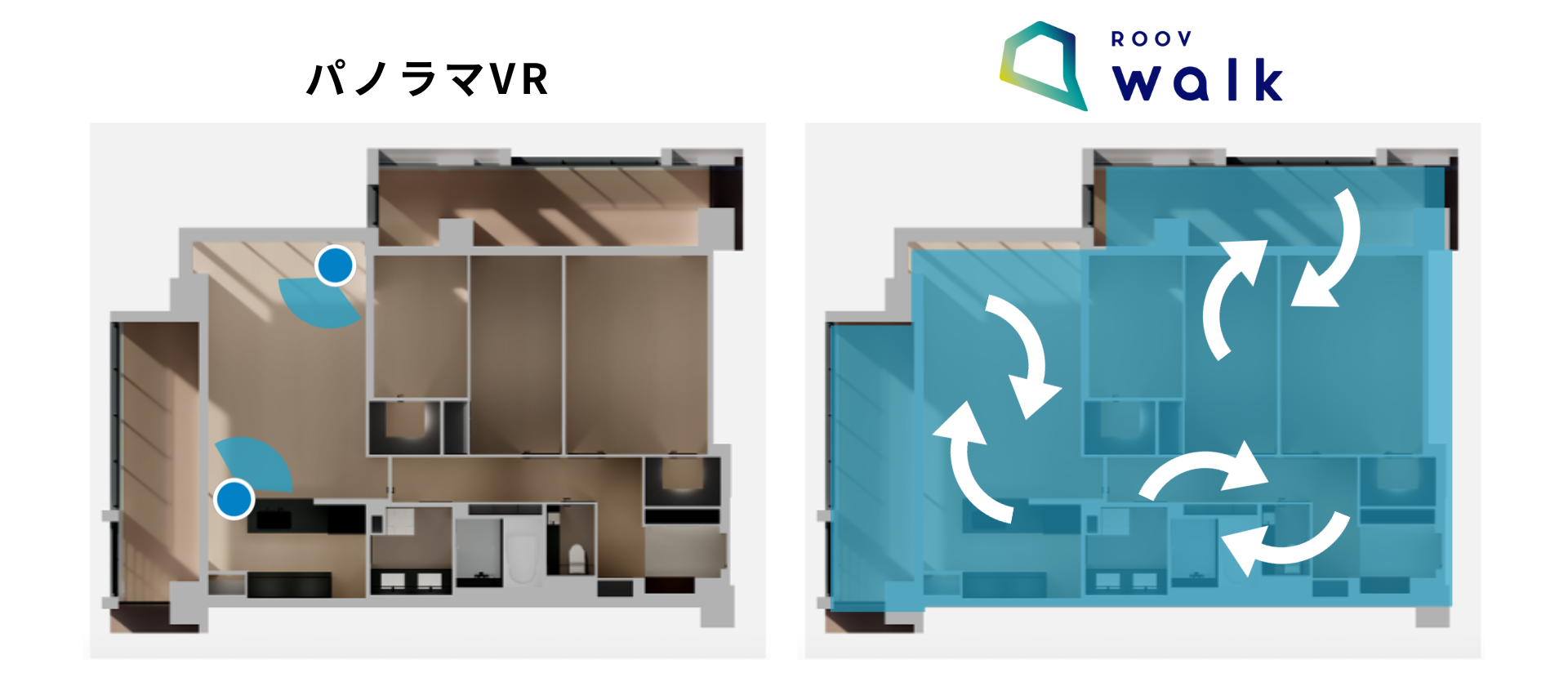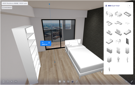 定点内覧しかできないパノラマVRとは異なり、『ROOV walk』は3DCG空間内を自由自在に移動できるので、生活動線の確認やその部屋での生活をより具体的にイメージすることができます。