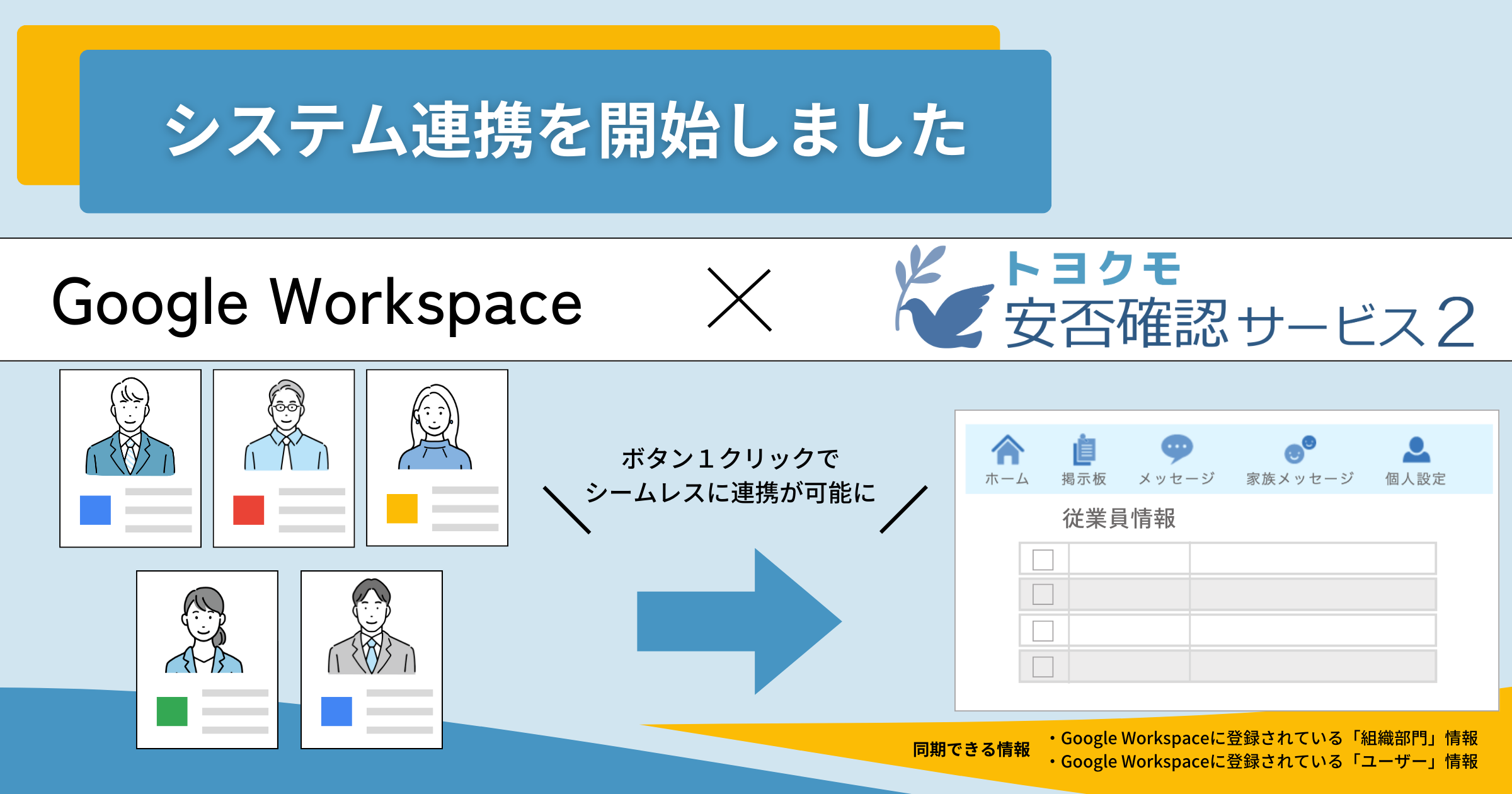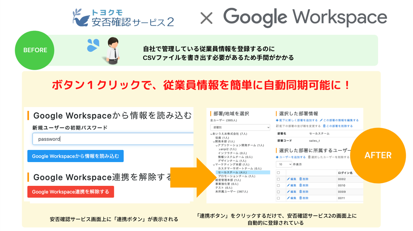 この度の連携により、「Google Workspace」に登録されているユーザーおよび部署情報を、「安否確認サービス2」にシームレスに取り入れることが可能となります。