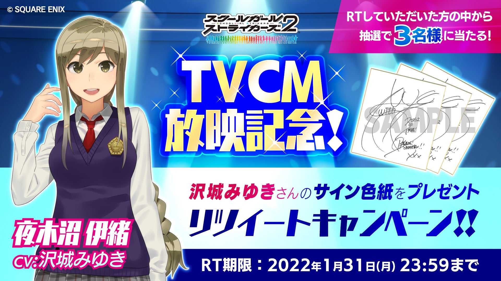 株式会社スクウェア・エニックス(本社:東京都新宿区、代表取締役社長:松田洋祐、以下スクウェア・エニックス)は、スマートフォン向けゲーム『スクールガールストライカーズ2(以下、スクスト2)』において、2022年1月9日(日)より沢城みゆきさん演じる夜木沼伊緒が出演する新TVCM「2022年もよろしく!スク☆スク☆スクスト篇」をTOKYO MXにて放映開始いたします。