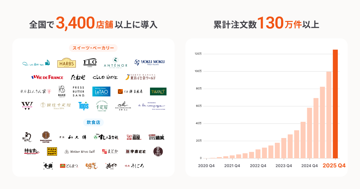 サービス開始から6年で全国3,400店舗以上に導入され、累計注文数は130万件を突破しました(2026年1月時点)。電話対応や店頭受付の負担軽減、聞き間違いなどのトラブル抑制を通じて、現場の生産性向上に寄与する仕組みとして活用が進んでいます。