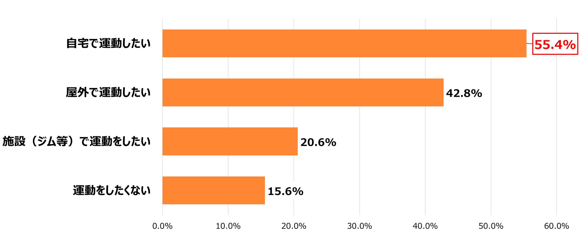 健康のための運動に関して、どのような場所で運動したいか聞いたところ最も多い回答は、“自宅で運動したい”が約6割(55.4%)、続いて“屋外で運動したい”(42.8%)、“ジム等の施設で運動したい”(20.6%)、“運動したくない”が(15.6%)という結果になりました。軽い運動やストレッチから始めやすい自宅での運動が最も多い結果になりました。