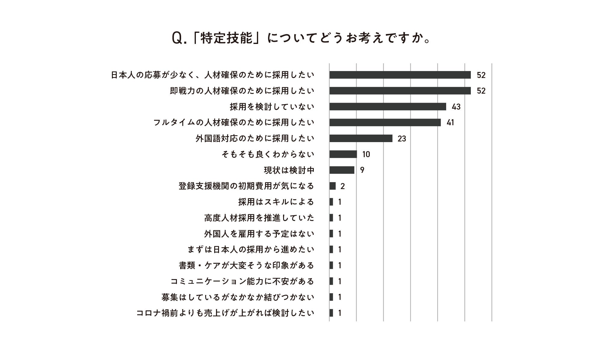 このような中、外国人人材の採用に関しては、半数以上が採用していないと、外国人人材の雇用が進んでいない現状も。例えば、働き手不足の解消を目的として設立された在留資格「特定技能制度」については、9割以上が理解していると回答しているにも関わらず、設立から3年経過した今でも、現場での活用が積極的に進んでいない可能性があることが見て取れた。