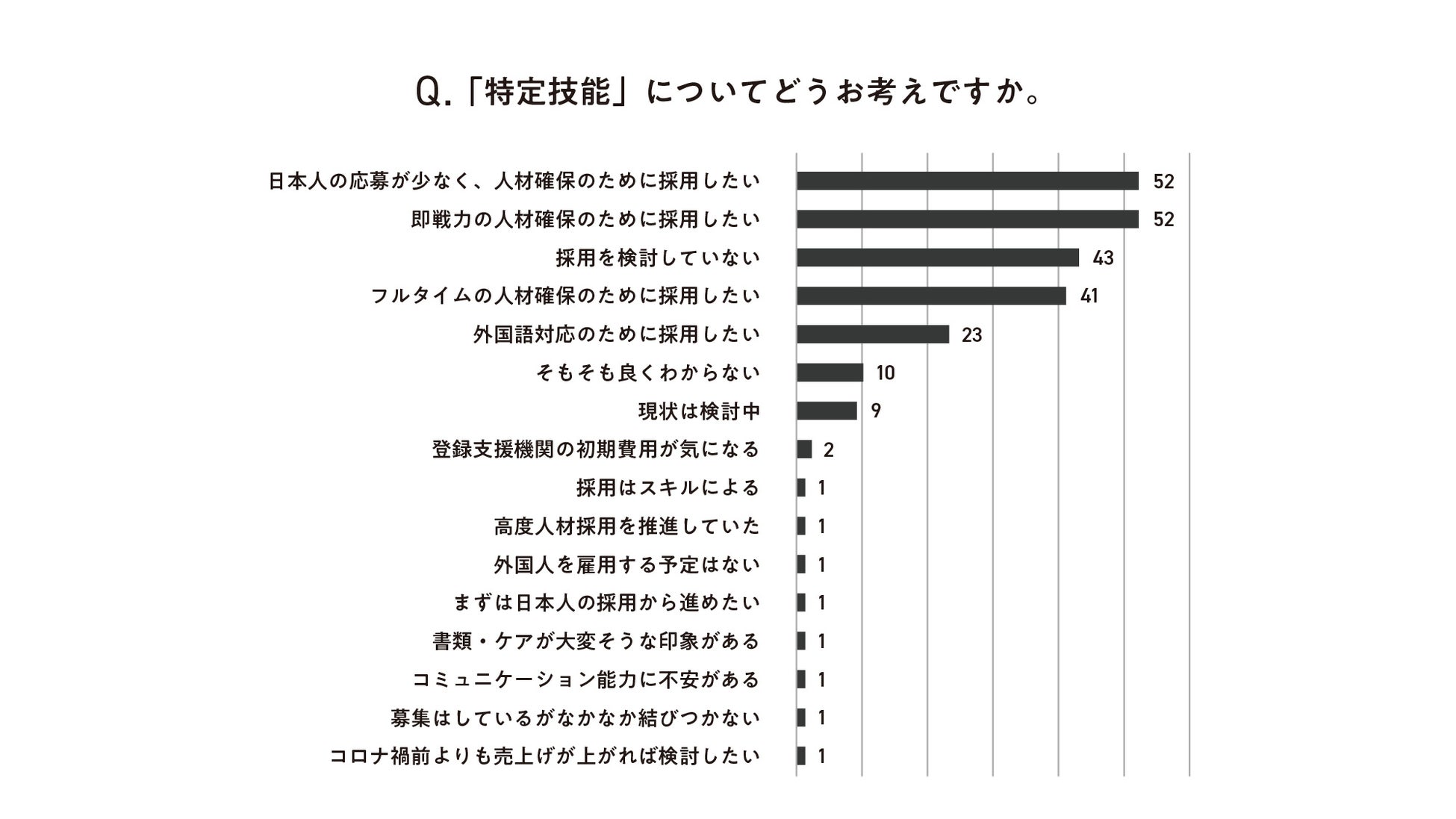 4.特定技能人材に対して、「日本人の応募が少なく、人材確保のために採用したい」、「即戦力の人材確保のために採用したい」と捉える旅館・ホテル事業者が最も多い。