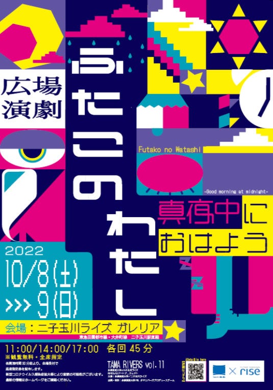 多摩美術大学(東京都世田谷区・八王子市 学長:建畠晢)はこのたび、上野毛キャンパスに隣接する二子玉川ライズとの地域連携アートプロジェクト『タマリバーズvol.11 』を、2022年10月8日(土)、9日(日)の2日間にわたり、世田谷区玉川の二子玉川ライズ ガレリアで開催いたします。広場演劇『ふたこのわたし 真夜中におはよう』の上演のほか、学生が作ったアート作品の販売やワークショップなどのイベントの開催も予定しています。また、近隣の保育園児とのコラボレーション企画も実施します。