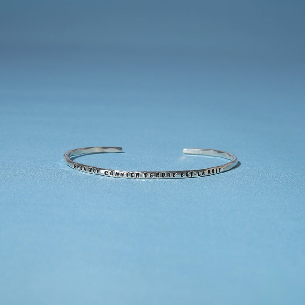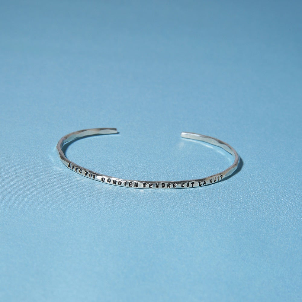 表面には、18世紀に生まれたロマン主義を代表するイギリスの詩人 ジョン・キーツが、フィアンセに宛てた手紙から着想を得て、"AVEC TOI COMBIEN TENDRE EST LA NUIT(君と一緒だと 夜はどれだけ 優しいのだろう)"という、情緒的なフレーズが刻まれています。ブランドの特徴であるスターリングシルバーの無骨な曲線美に、二人の男女の切ない恋の物語を表現しています。 2025年3月1日(土)より、全国の限定店舗及びオンラインストアにて50点の数量限定で販売を開始いたします。