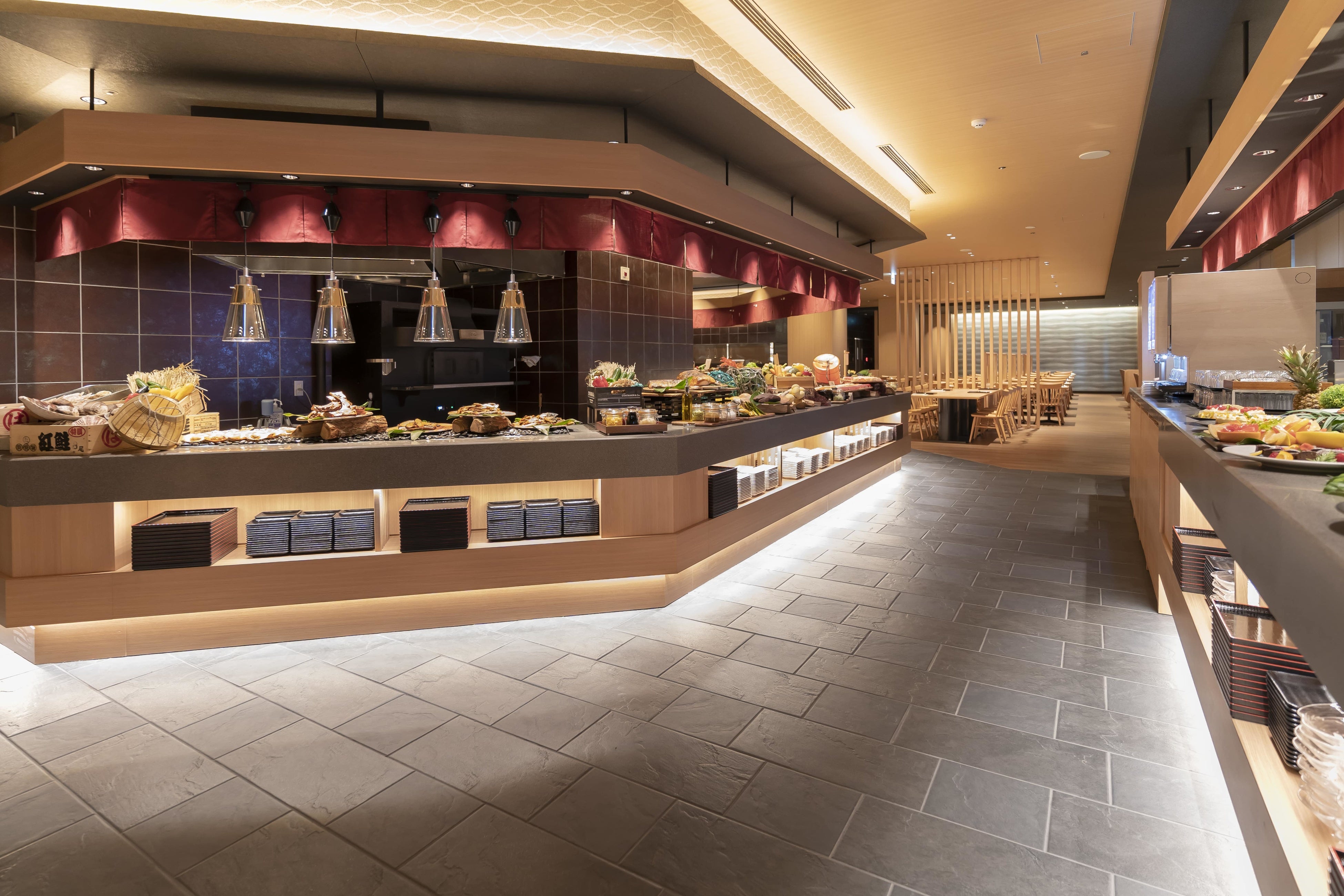 2Fのブッフェレストラン「月舟」では北海道 道南の食材をふんだんに使い、ライブキッチンにて新鮮な魚介類を豪快に使った寿司や海鮮丼コーナー、薪で焼き上げる魚介・肉類のオーブン料理、北海道スイーツコーナー等お客様の心とお腹を満たす豪華ブッフェがお楽しみいただけます。