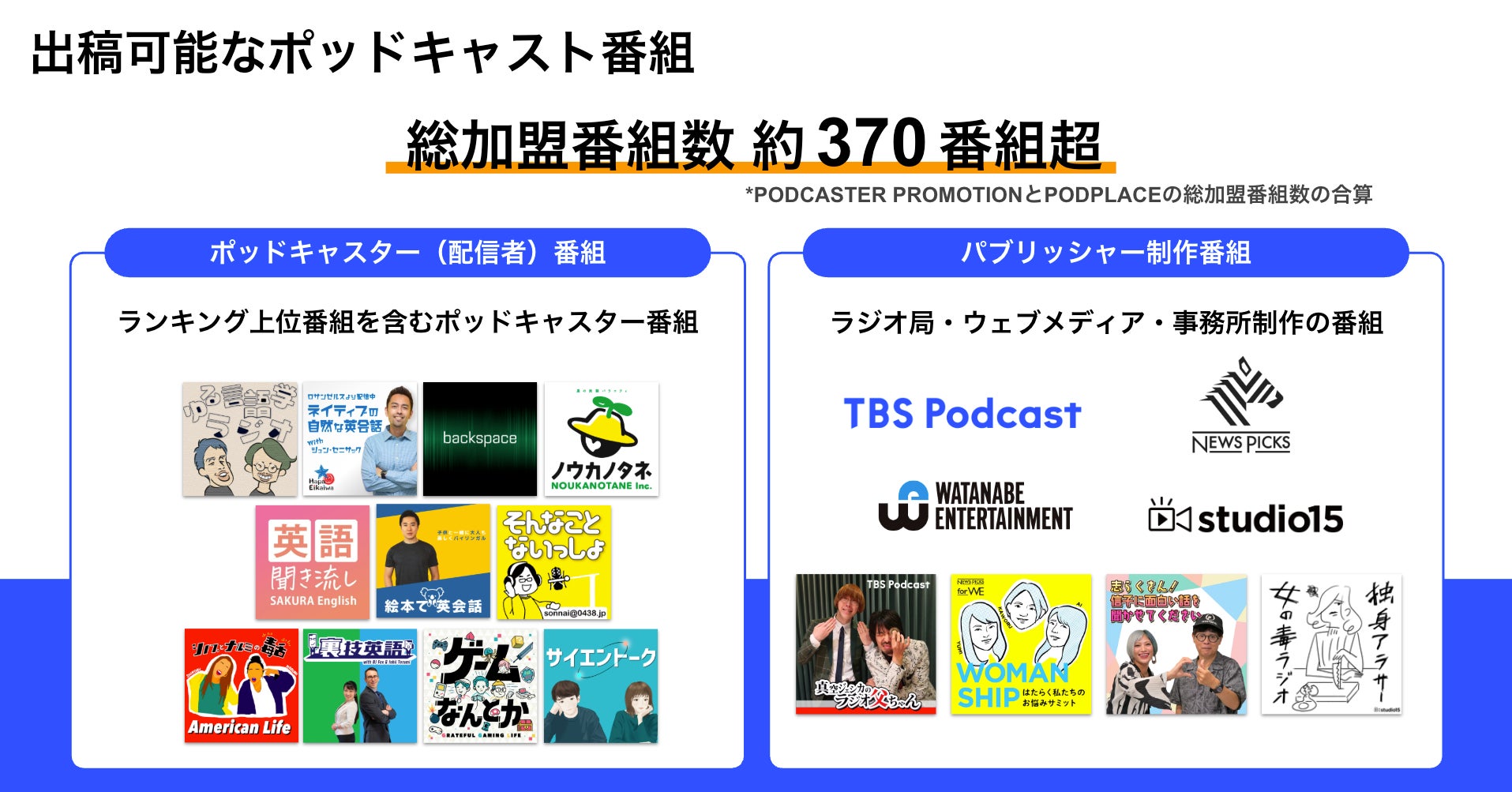 PODCASTER PROMOTIONには、今回追加されたTBSラジオの番組を含む370を超える多種多様なポッドキャスト番組が登録されており、広告主は出稿媒体を選択することができます。