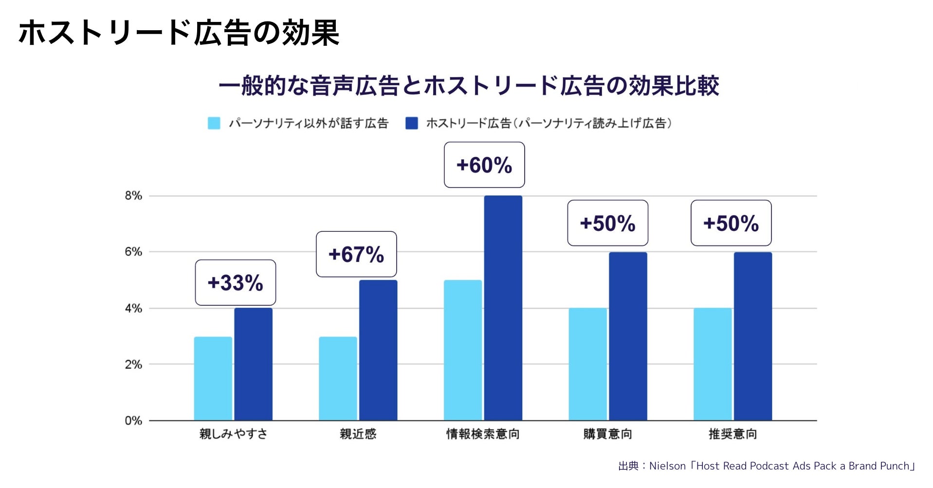 番組のパーソナリティが広告を読み上げる手法は「ホストリード広告」と呼ばれています。米国で行われた調査では、ホストリード広告はナレーター読み上げの音声広告と比較して、「情報検索意向が60%高い」「購買意向が50%高い」といったブランドリフト効果が出る**など、高いプロモーション効果が実証されています。