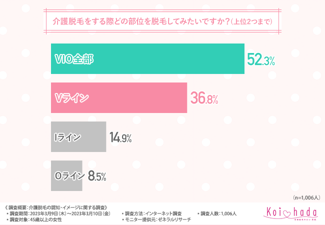 「介護脱毛をする際どの部位を脱毛してみたいですか?(上位2つまで)」と質問したところ、『VIO全部(52.3%)』と回答した方が最も多く、次いで『Vライン(36.8%)』『Iライン(14.9%)』『Oライン(8.5%)』と続きました。