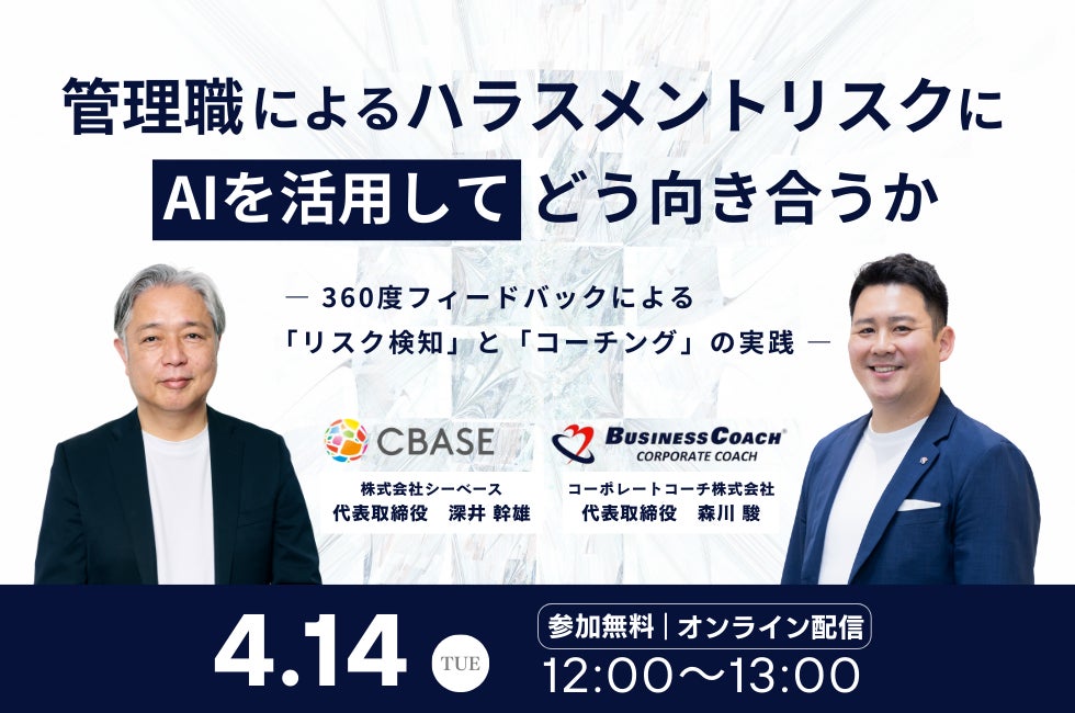 今回のセミナーでは、360度フィードバックの活用を支援するシーベースと、組織を内側から変えるコーポレートコーチが連携し、「360度フィードバック」を用いてリスクを可視化し、本人に“気づき”を与える方法から、「コーチング」によってその気づきを“行動化・習慣化”させるための具体的なアプローチまでを余すところなくお伝えします。