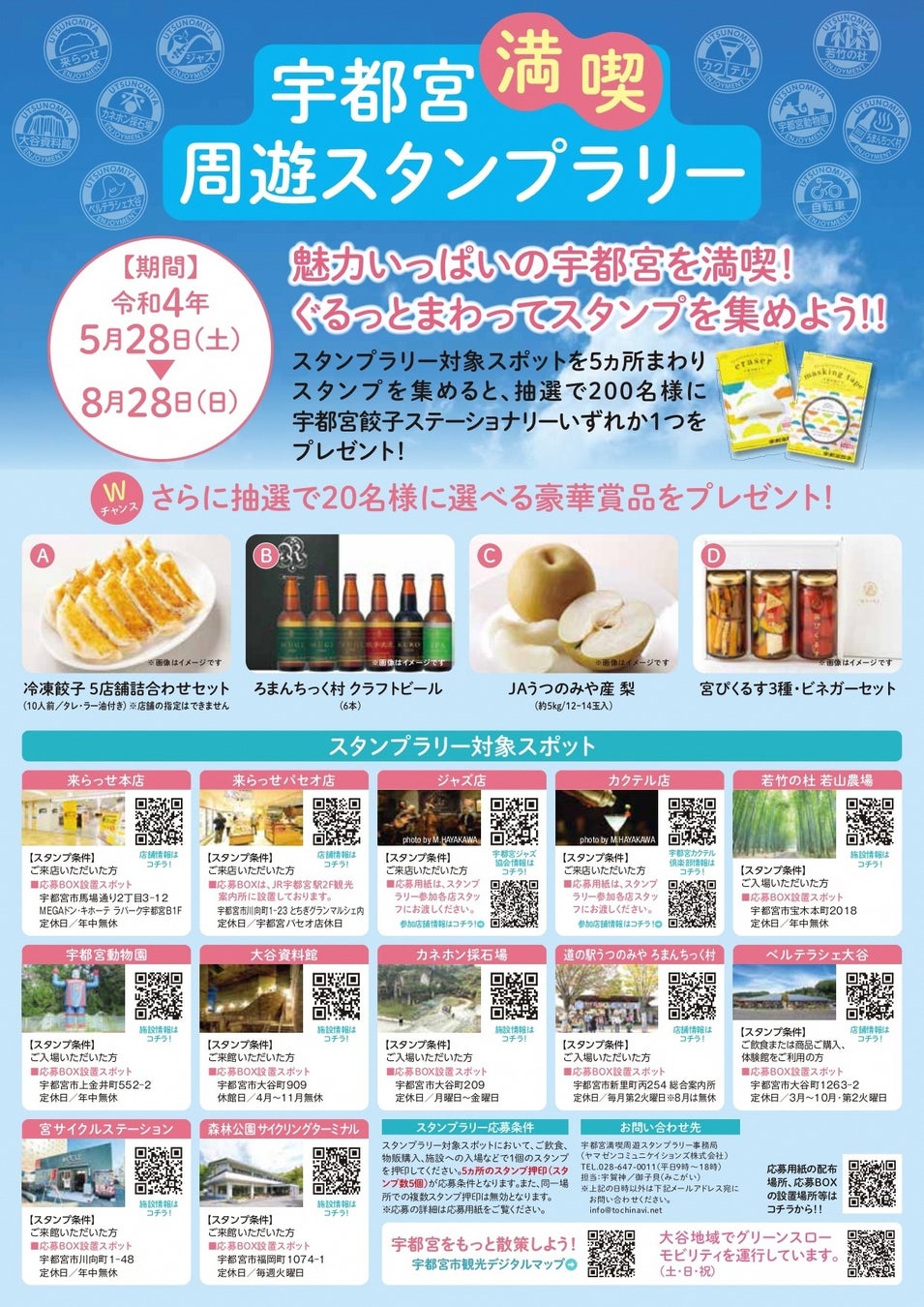 「宇都宮満喫周遊スタンプラリー」は、対象スポット8か所のうち5か所をまわり、スタンプを集めると、抽選で200名に餃子ステーショナリーグッズをプレゼント、また、Wチャンスとして抽選で20名に選べる豪華景品が当たる、宇都宮の魅力を満喫しながら景品が当たる、Wで楽しいスタンプラリーとなっております。