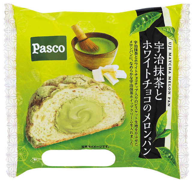 宇治抹茶とホワイトチョコチップ入りのビスケット生地をかぶせたメロンパンに、なめらかな宇治抹茶ホイップクリームを入れました。