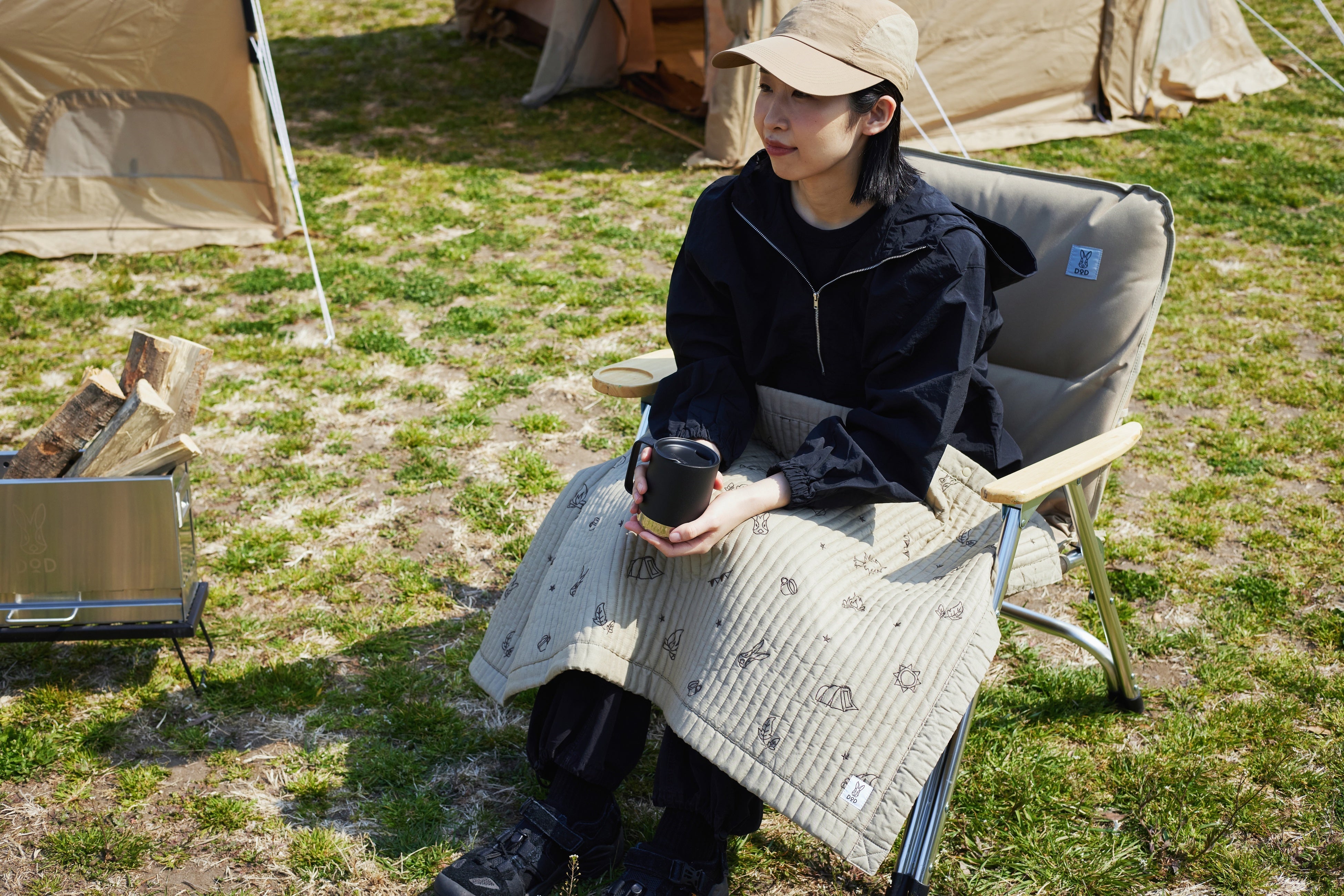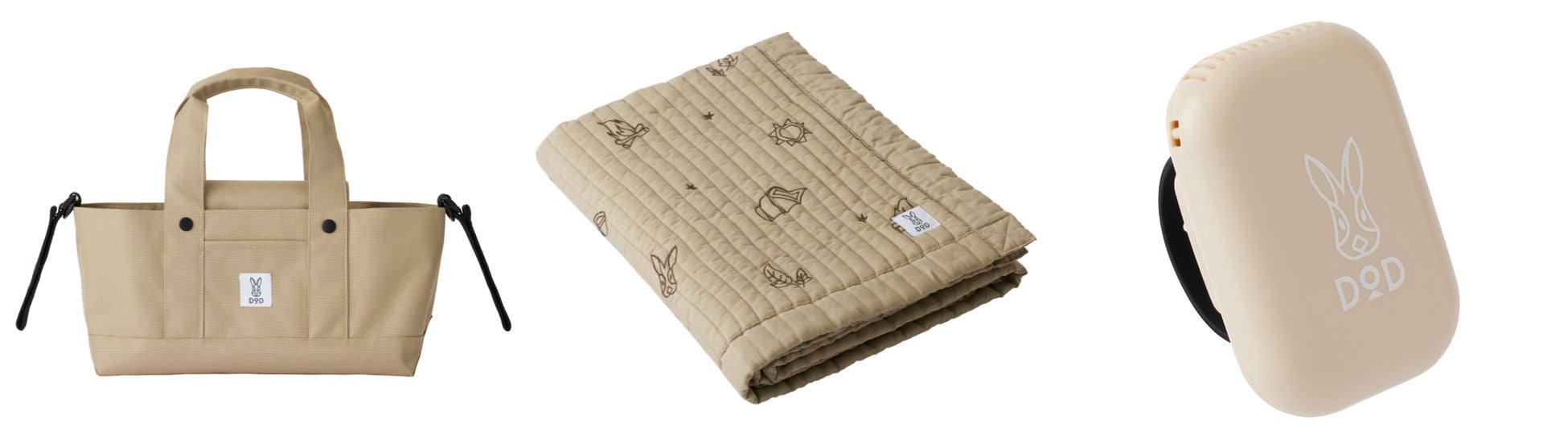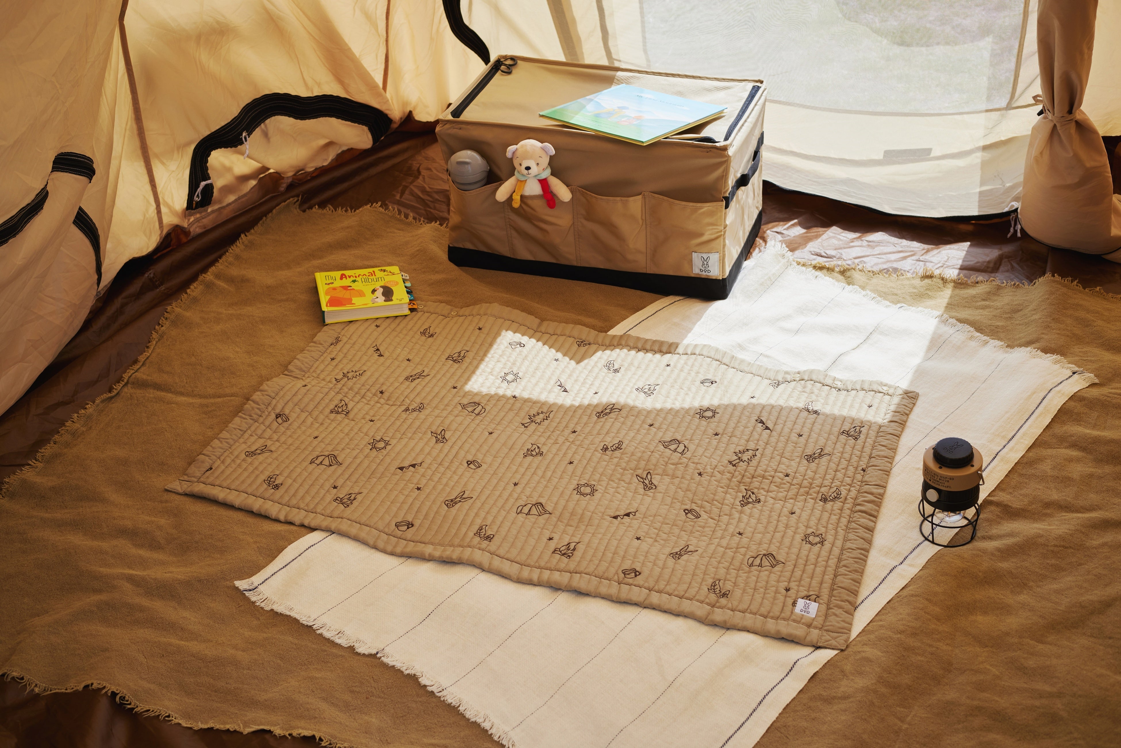 DODロゴのウサギ、DODの人気商品「カマボコテント」、焚き火などキャンプモチーフの刺繍がかわいい、マルチに使えるキルトケット。