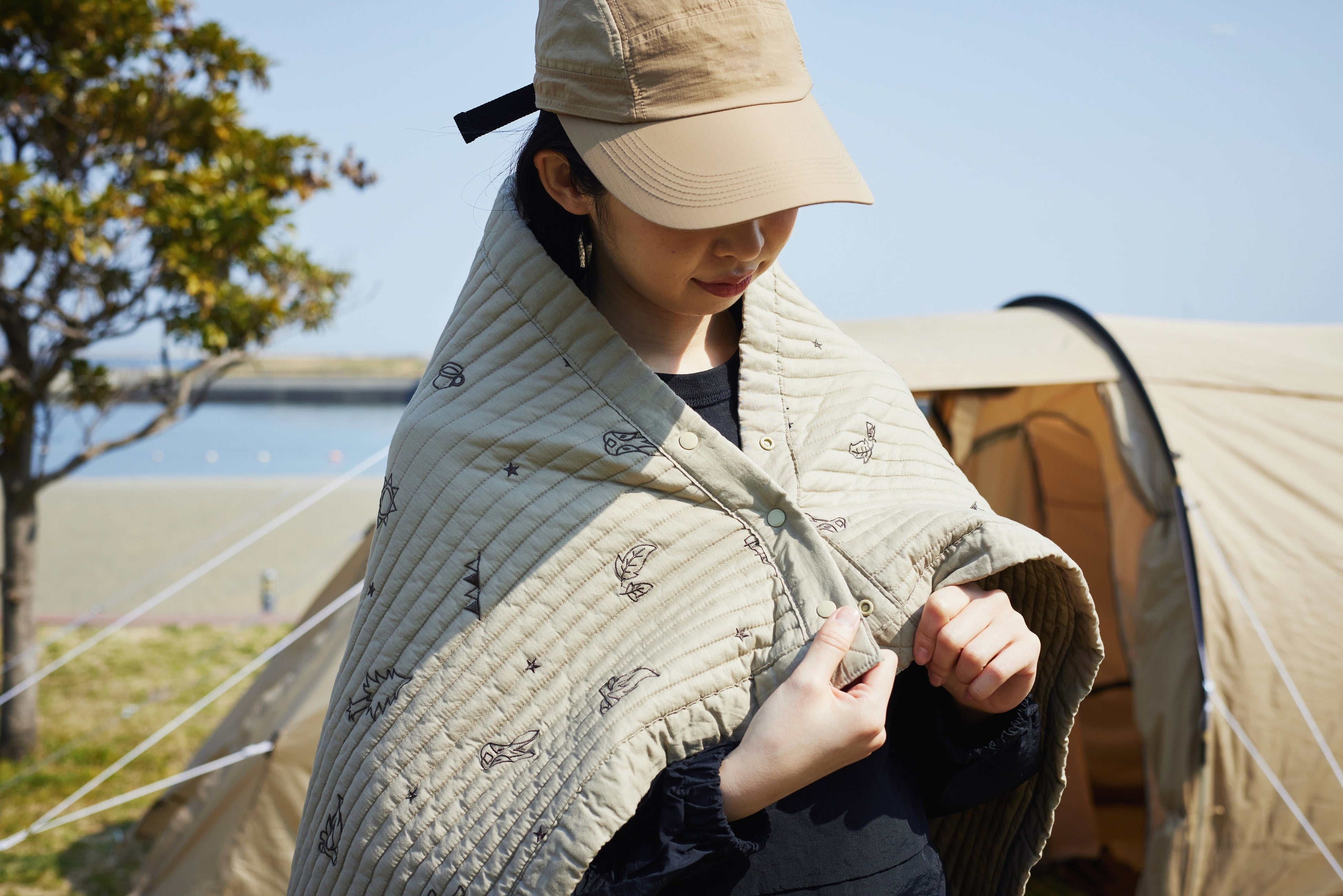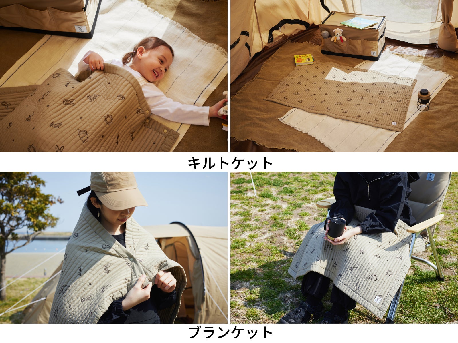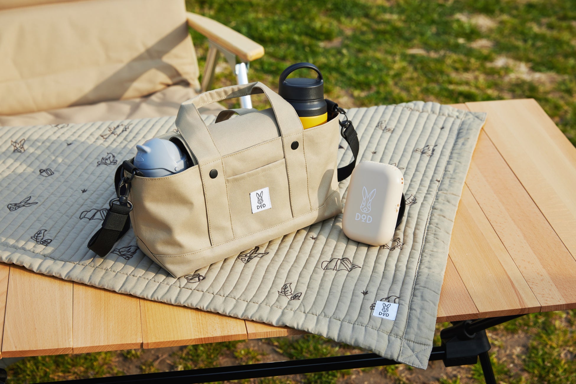 DODロゴのウサギ、DODの人気商品「カマボコテント」、焚き火などキャンプモチーフの刺繍がかわいい、マルチに使えるキルトケット。