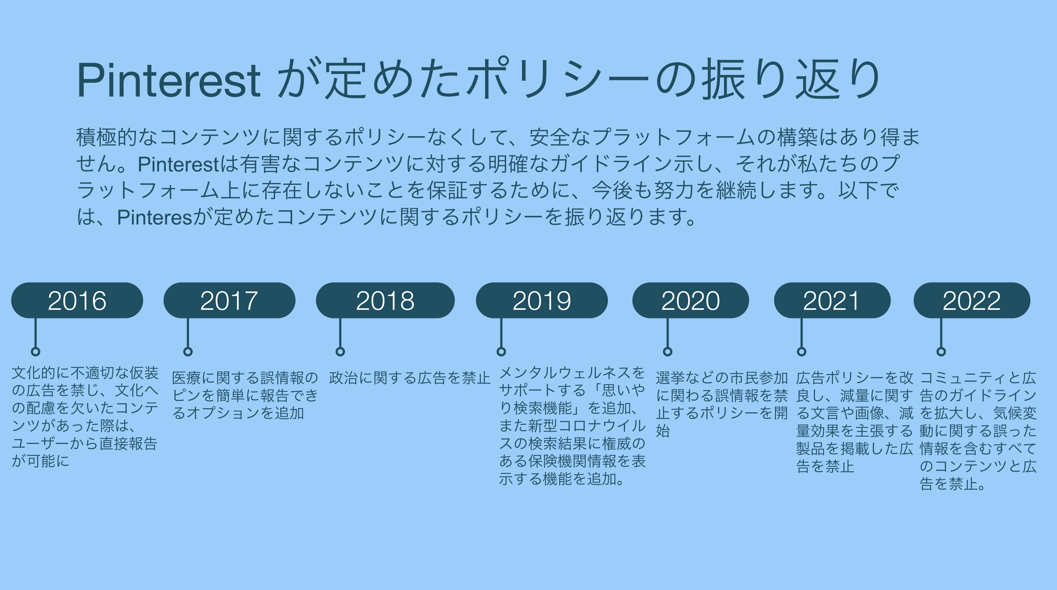「Pinterest はユーザーの皆さまに、事実に基づいた情報によって信頼できる環境を構築する重要性を認識しています。今回の大きなアップデートにより、広範囲にわたる誤情報ガイドラインがさらに拡充されます。ガイドラインは、公衆衛生に関する誤情報に対処するため 2017 年に初めて設けられて以来、世界の情勢の変化にあわせてアップデートを重ねてきました。気候変動に関する誤情報ポリシーの拡充は、誤情報と戦い、安全な場所をオンラインに生み出すための Pinterest の取り組みにおける新たな一歩です。」