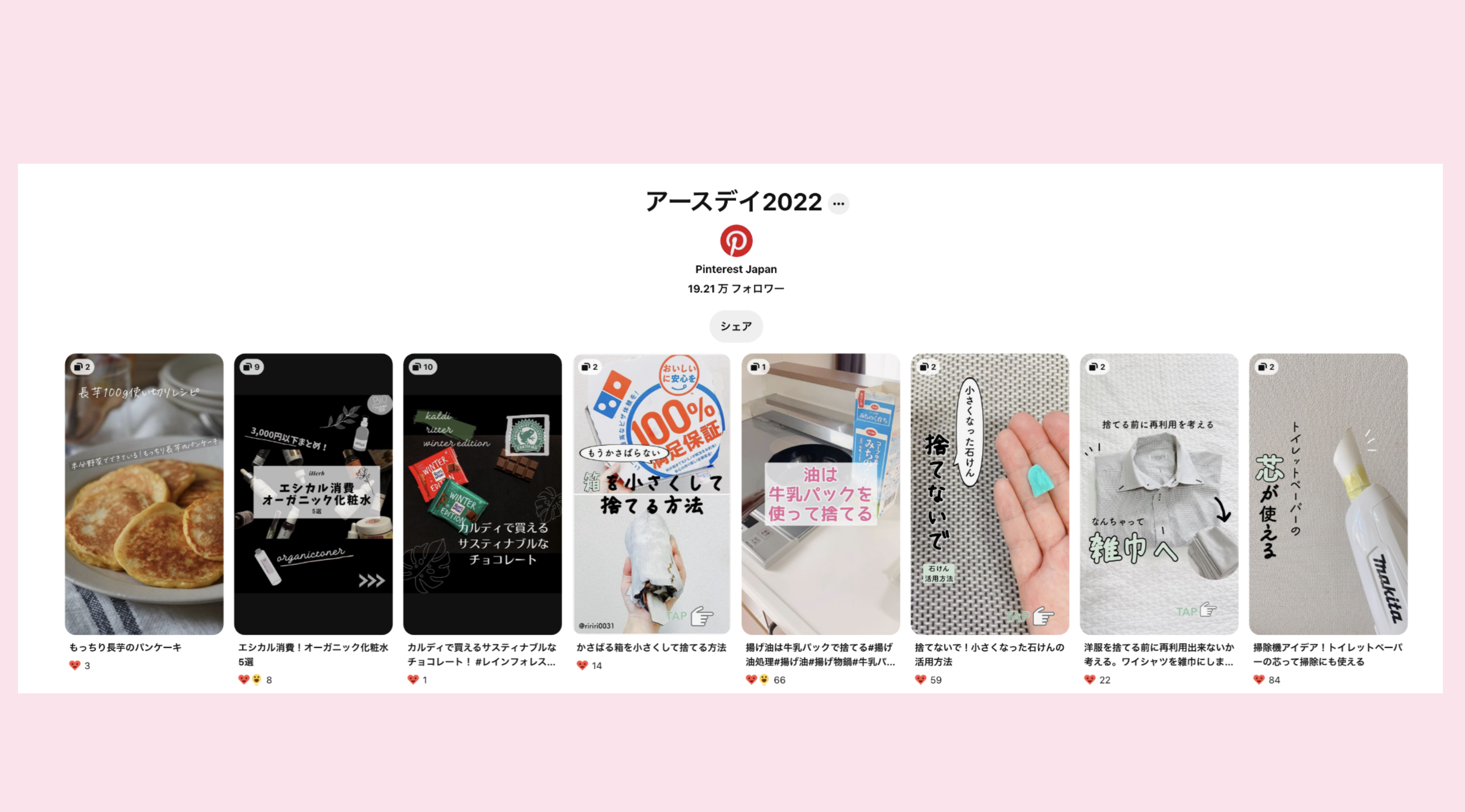 環境に配慮した生活に関するアイデアの発信をさらに活発にするため、日本、米国、英国、オーストラリア、ドイツ、フランス、ブラジル、メキシコ、アルゼンチン、インドネシア、インドの Pinterest 人気クリエイターが、Pinterest オリジナル コンテンツシリーズを Pinterest 上で公開しています。オリジナルコンテンツ に参加するクリエイターは、アイデアピンで「リサイクルのコツ」、「エシカル消費」、「再利用のコツ」などのトピックについてのユーザーの興味関心を刺激します。さらに、「環境に優しい生活」や「持続可能な暮らし」などの関連トピックを検索するユーザーには、4月22日のアースデイまでの期間、その日のおすすめの記事にアクセスできるピンが表示され、ユーザーは持続可能性に関する厳選されたボードとインスピレーションを与えるコンテンツを見ることができます。