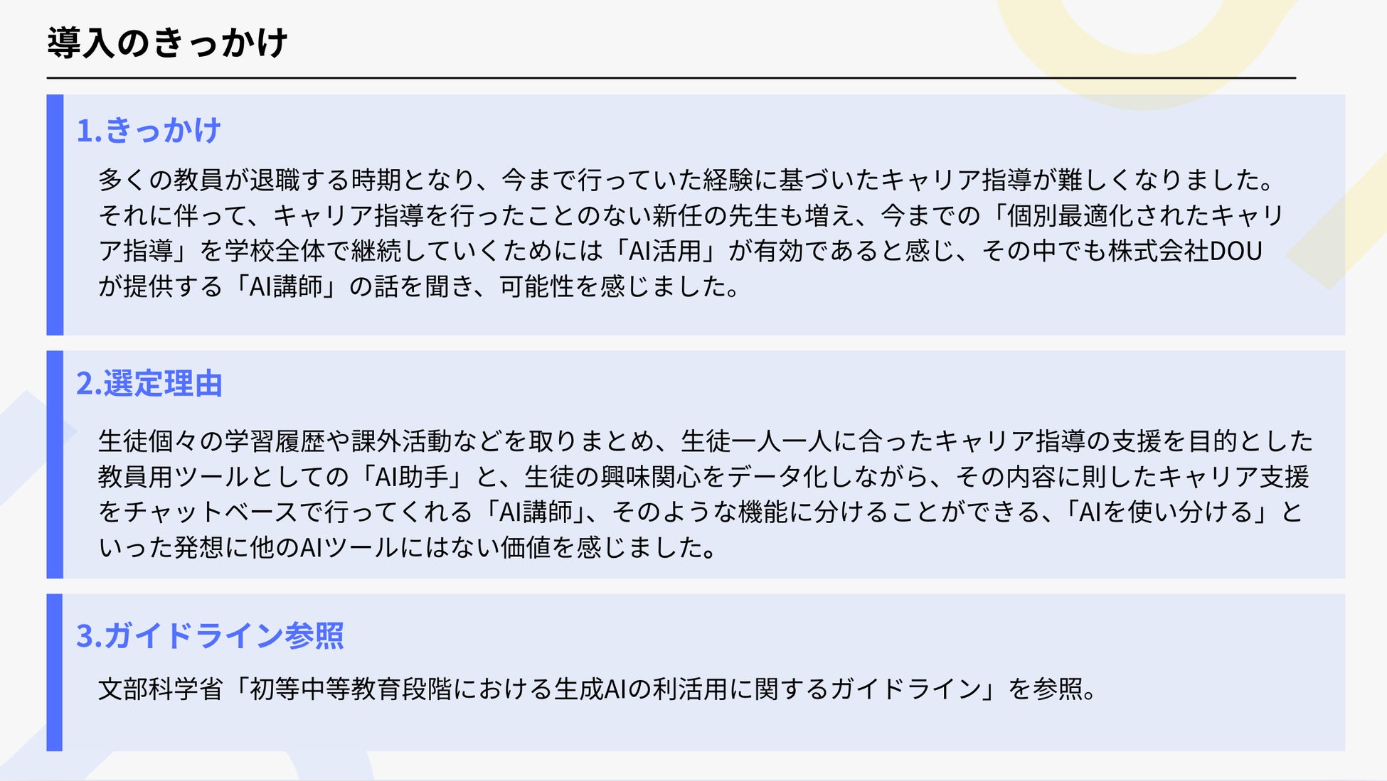 株式会社DOUは、こうした課題意識のもと、本事例で紹介した「AI講師」を活用し、進路支援・キャリア支援における個別最適化や教員の工数削減に加え、授業や探究学習なども含めた教育機関におけるAI活用の実践を、高校・大学と連携しながら進めています。
