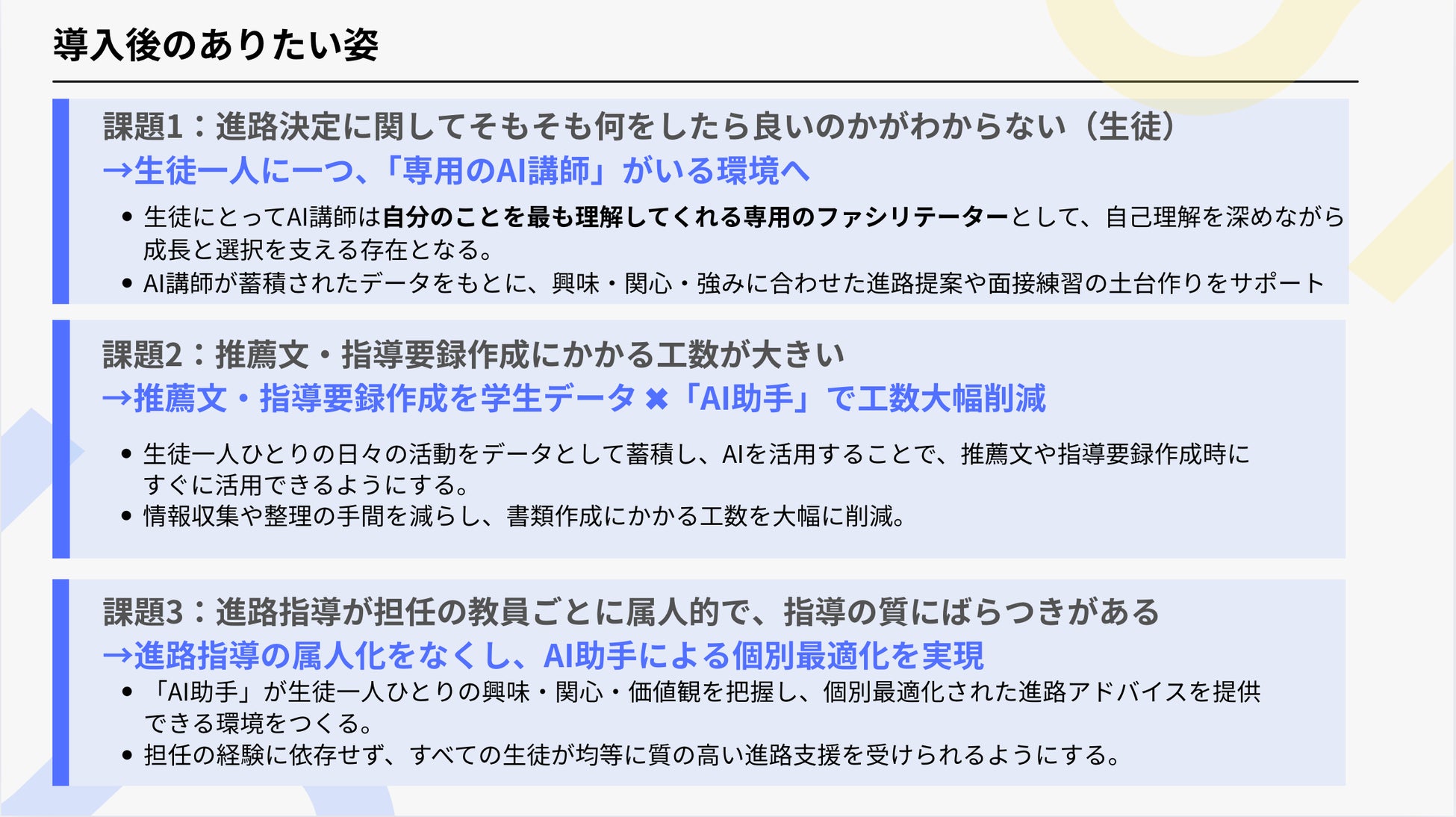 本事例は、高校の進路指導において教員個々の経験や進め方に依存しがちな状況を踏まえ、AIとデータを活用することで、属人化せず、すべての生徒に個別最適化された指導を提供することを目指した取り組みです。