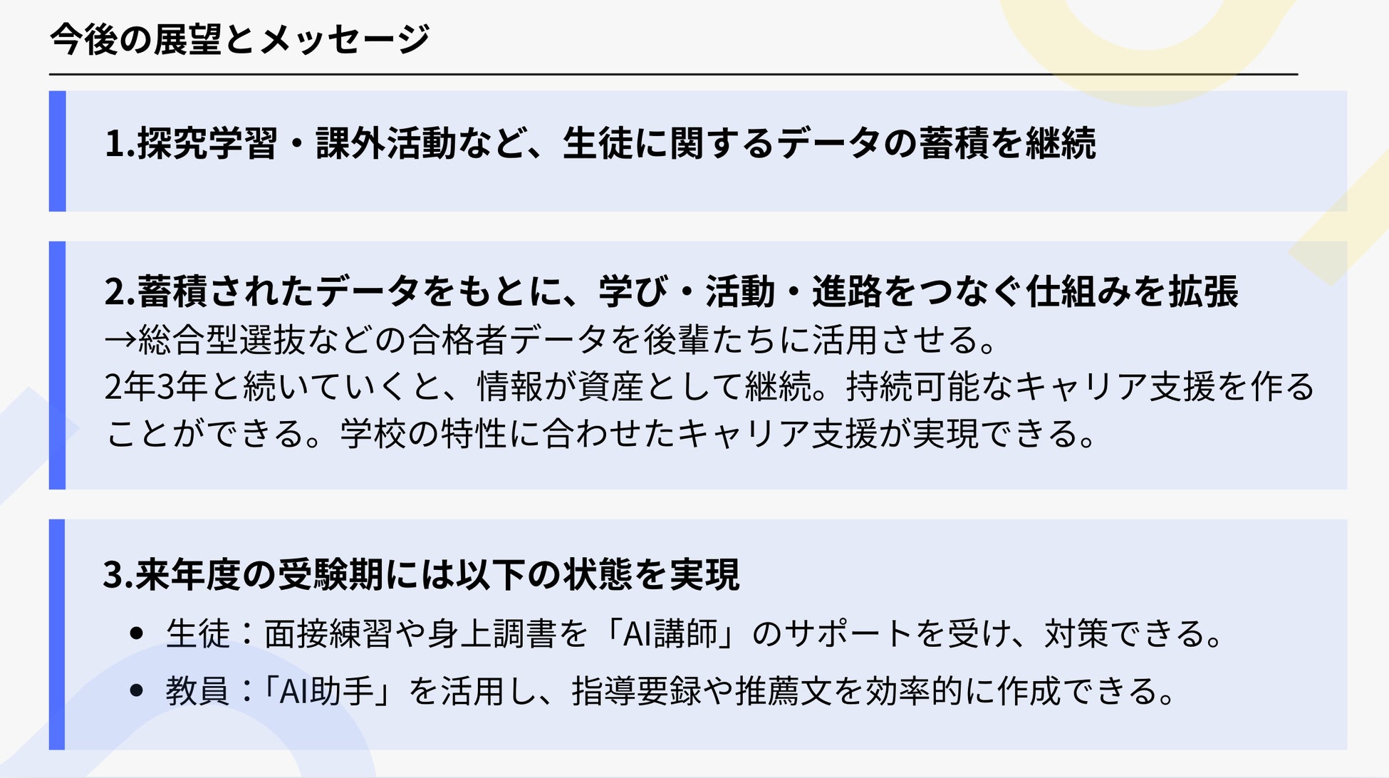 こうした取り組みを通じて、属人化を抑えながら、すべての生徒に対して個別最適化された進路支援を継続的に提供できる環境の実現を目指していきます。