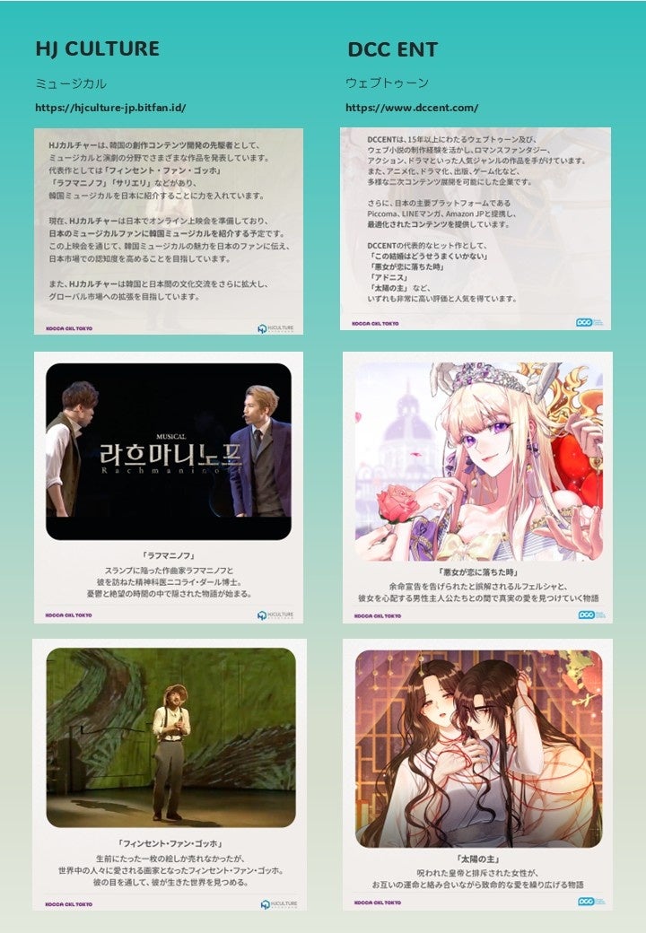 本出展は、韓国コンテンツ企業の日本進出を支援する拠点「KOCCA CKL TOKYO」に入居する企業によるもので、映像制作・ウェブトゥーン・ミュージカル・ARテクノロジーなど、多様なジャンルの最新コンテンツや技術を紹介いたします。日本のコンテンツ、メディア、エンターテインメント、舞台制作、スポーツなどの分野で、新たなビジネスパートナーシップと共同企画の創出を目指します。
