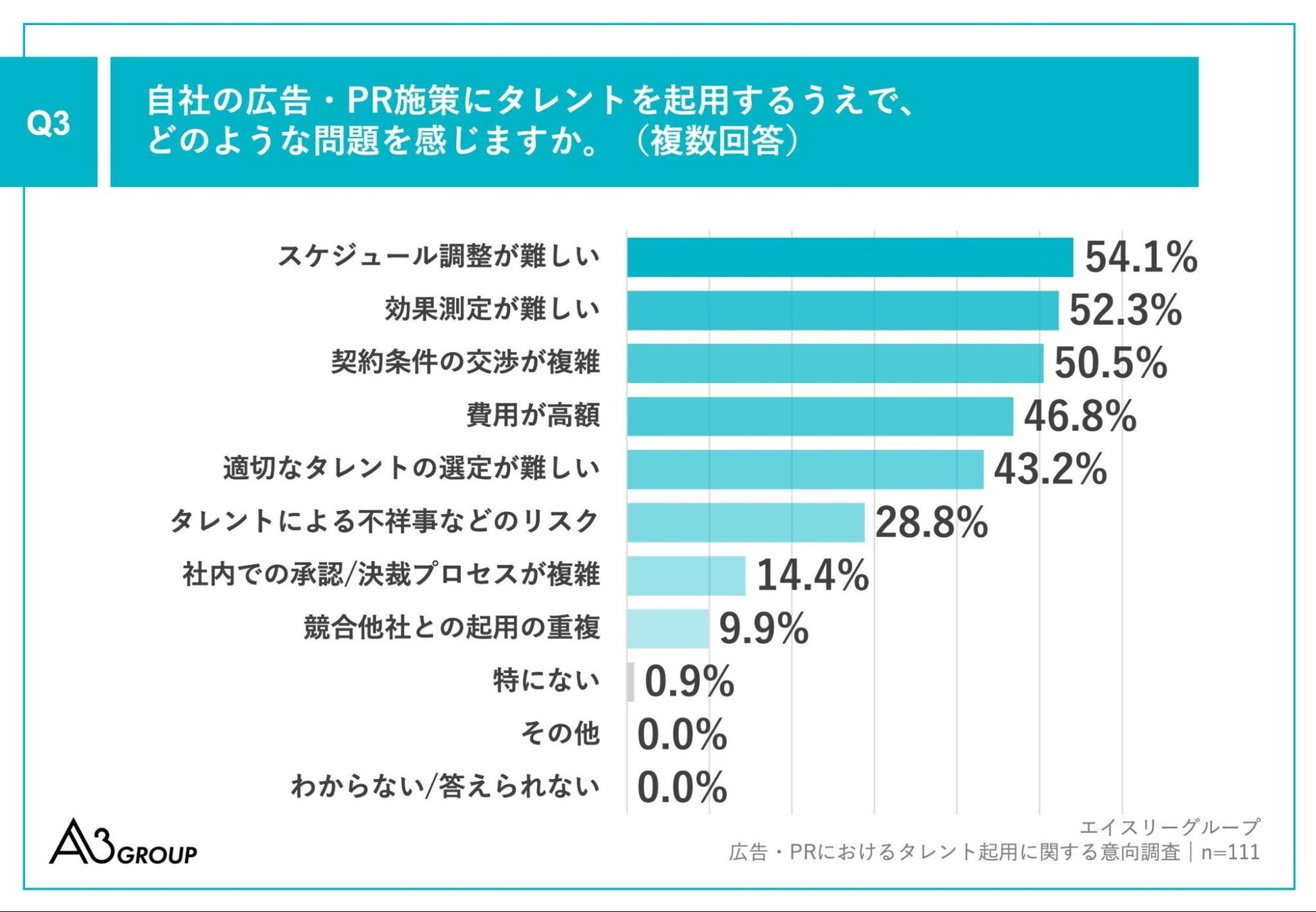 「Q3.自社の広告・PR施策にタレントを起用するうえで、どのような問題を感じますか。(複数回答)」(n=111)と質問したところ、「スケジュール調整が難しい」が54.1%、「効果測定が難しい」が52.3%、「契約条件の交渉が複雑」が50.5%となりました。