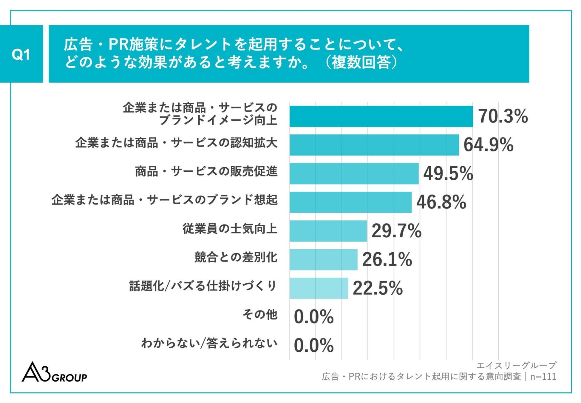 「Q1.広告・PR施策にタレントを起用することについて、どのような効果があると考えますか。(複数回答)」(n=111)と質問したところ、「企業または商品・サービスのブランドイメージ向上」が70.3%、「企業または商品・サービスの認知拡大」が64.9%、「商品・サービスの販売促進」が49.5%となりました。