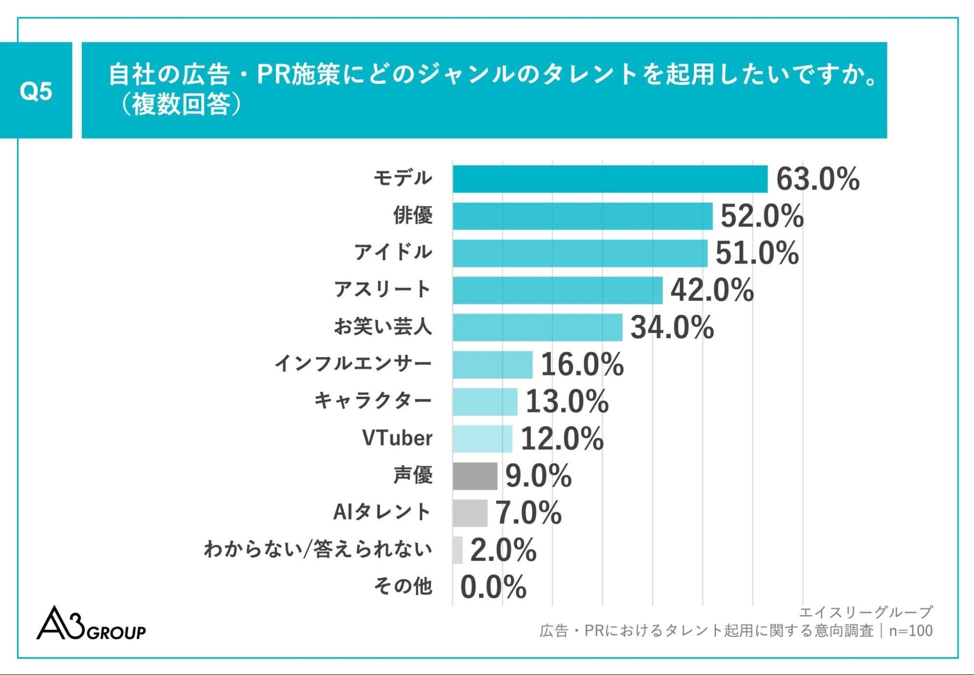 Q4で「非常にそう思う」「ややそう思う」と回答した方に、「Q5.自社の広告・PR施策にどのジャンルのタレントを起用したいですか。(複数回答)」(n=100)と質問したところ、「モデル」が63.0%、「俳優」が52.0%、「アイドル」が51.0%となりました。