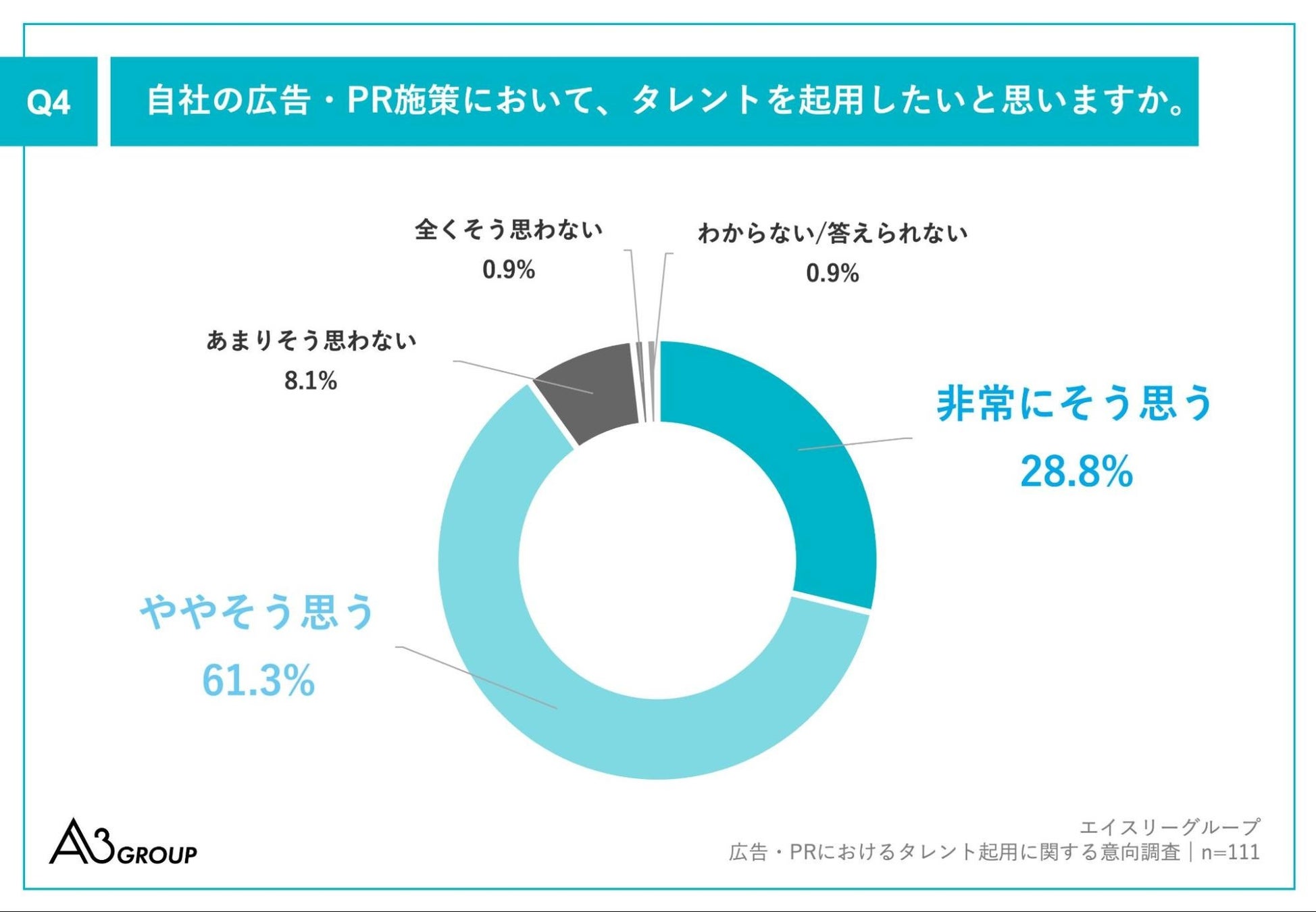 「Q4.自社の広告・PR施策において、タレントを起用したいと思いますか。」(n=111)と質問したところ、「非常にそう思う」が28.8%、「ややそう思う」が61.3%となりました。