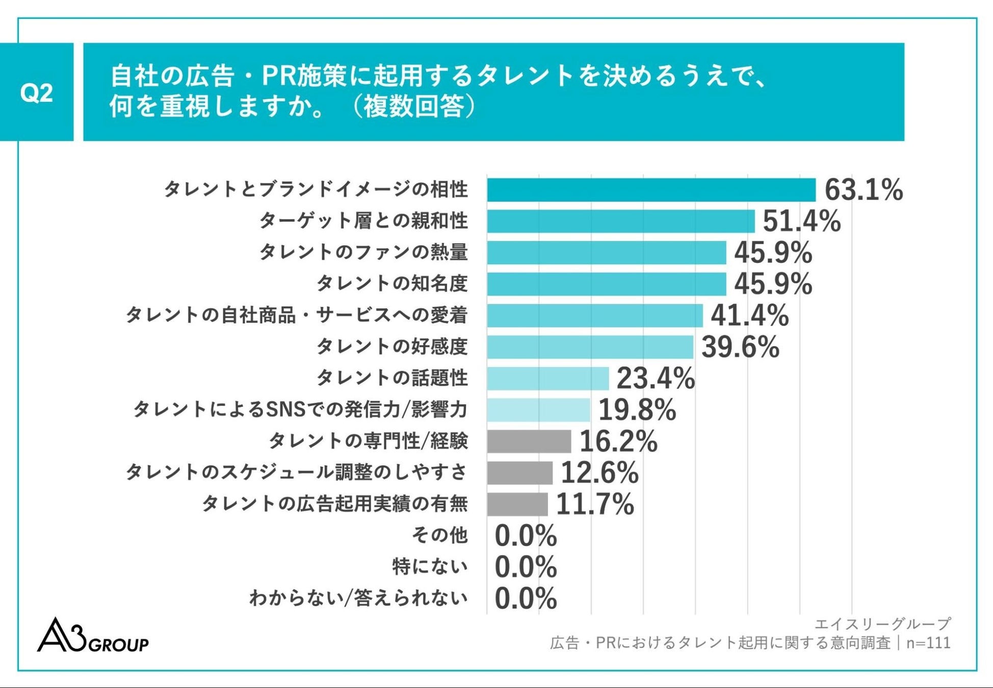 「Q2.自社の広告・PR施策に起用するタレントを決めるうえで、何を重視しますか。(複数回答)」(n=111)と質問したところ、「タレントとブランドイメージの相性」が63.1%、「ターゲット層との親和性」が51.4%となりました。