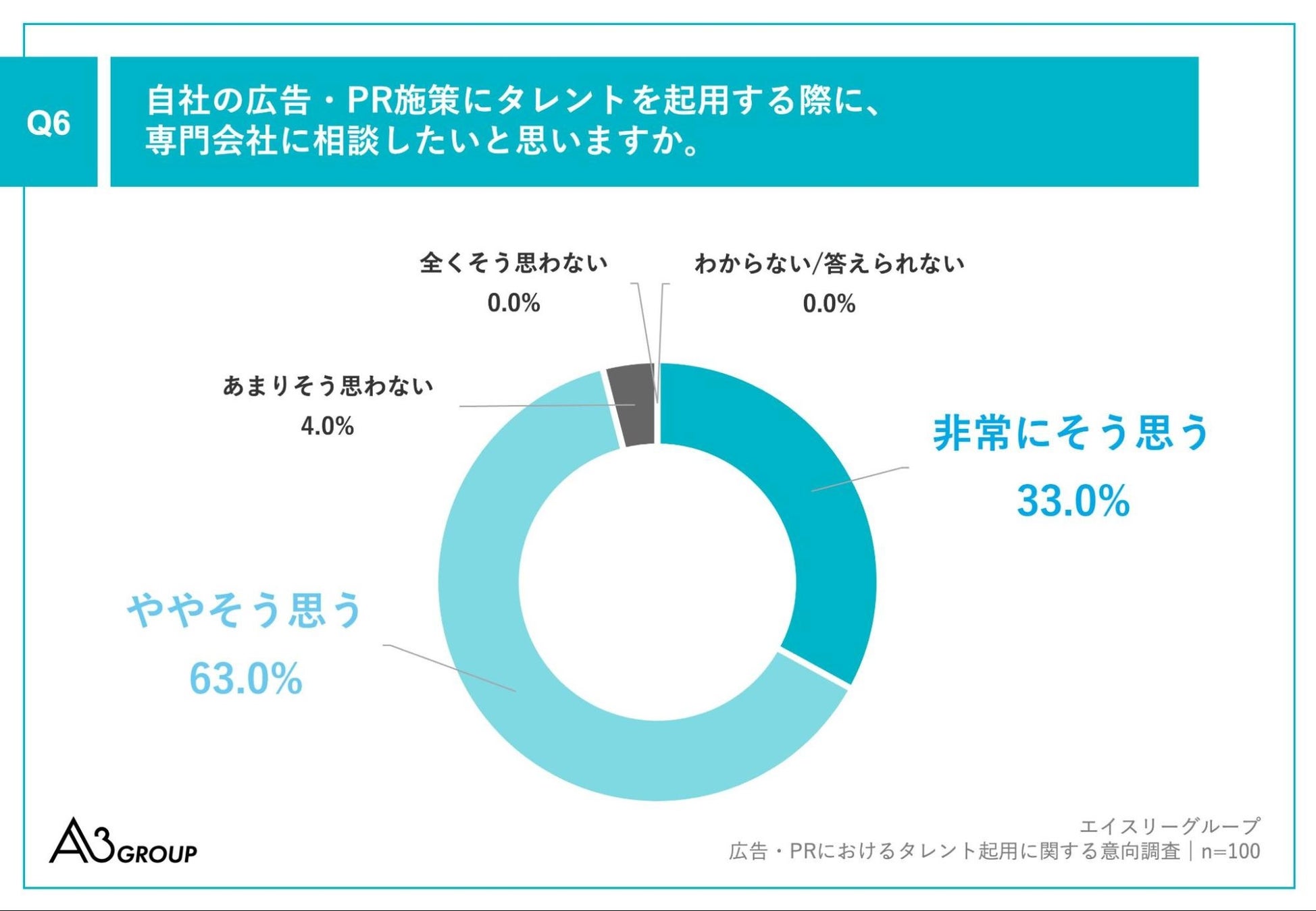 Q4で「非常にそう思う」「ややそう思う」と回答した方に、「Q6.自社の広告・PR施策にタレントを起用する際に、専門会社に相談したいと思いますか。」(n=100)と質問したところ、「非常にそう思う」が33.0%、「ややそう思う」が63.0%となりました。