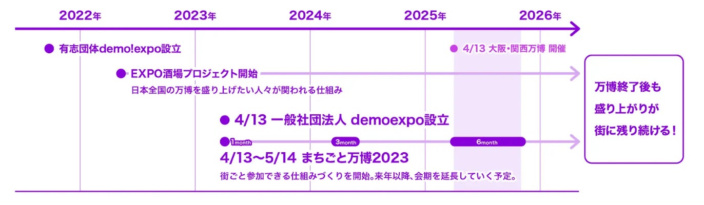 demo!expoは「街の人を主役に、街から万博をつくっていく」を目標に掲げ、2025年に向けて活動しています。その集大成として、街からもう1つの万博「まちごと万博」を創り上げることを目指しています。
