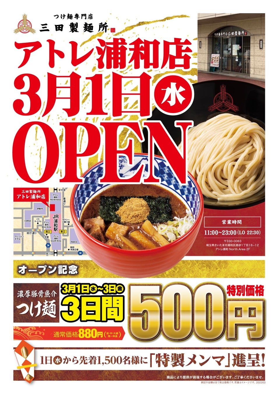【三田製麺所】埼玉初進出! 『アトレ浦和店』3月1日(水) グランドOPEN OPEN3日間は濃厚豚骨魚介つけ麺を500円で提供