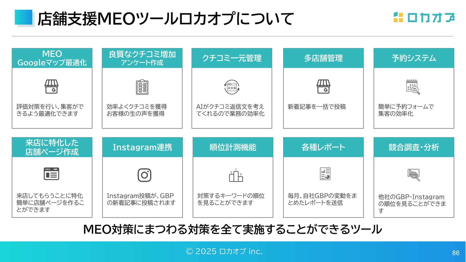 セミナーの終盤では、MEO・クチコミ・広告・予約・分析までを一気通貫で支援するSaaS型店舗集客ツール「ロカオプ」の活用例が紹介されました。特にクリニックのような予約来院型ビジネスにおいては、「限られたリソースで最大限の成果を出す」ための仕組みづくりとして注目されています。