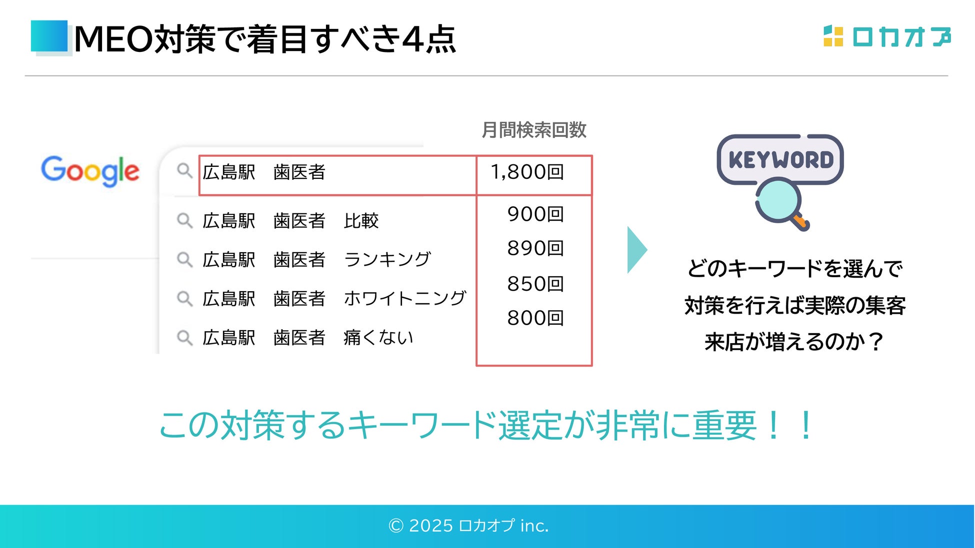 MEOで成果を上げるためには、ただ対策を行うのではなく、競合に勝てる「戦略的キーワード選定」が出発点となります。セミナーでは、「広島駅 歯医者」「〇〇市 産科」「〇〇市 クリニック」などの具体例をもとに、検索回数が多くマップ表示が出るかどうかを確認することがまず重要だと解説されました。