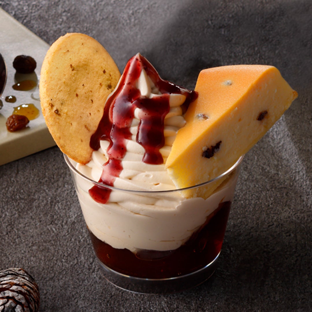 チーズケーキとチーズクッキーをのせたサンデーに、季節限定フレーバー『チーズケーキサンデーラムレーズン&ブルーベリー』が新登場します。上品な紅茶の香りがひろがる紅茶ゼリーに甘美な香りのラムレーズンソースをあわせ、ベイクドチーズケーキの風味がお楽しみいただけるチーズケーキソフトを重ねました。上には新商品の『御用邸ラムレーズンチーズケーキ』と『御用邸ラムレーズンチーズクッキー』をのせ、最後にブルーベリーソースをトッピング。ラムレーズンの甘美な香りと、ベリーの酸味がお楽しみいただけるこの時期だけのサンデーとなっています。